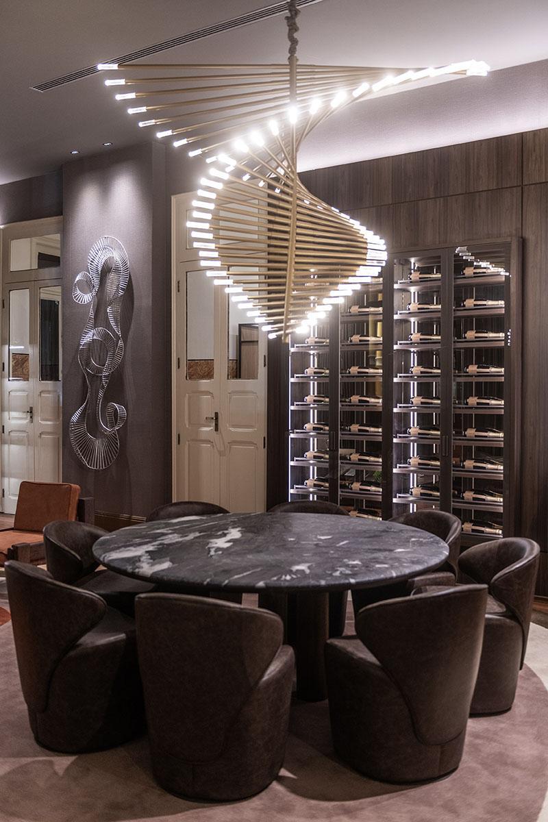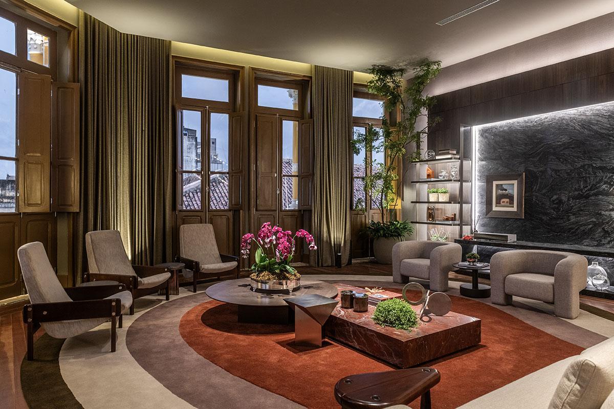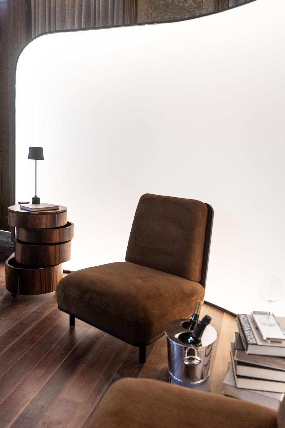 Mesmo sendo completamente estofada, a cadeira SUITE é esbelta, com curvas bem delineadas e desenho rico em detalhes. As costuras e tecidos estruturados, são aplicados como em vestidos de alta alfaiataria, e fazem com que tanto frente quanto o verso sejam valorizados e igual maneira.