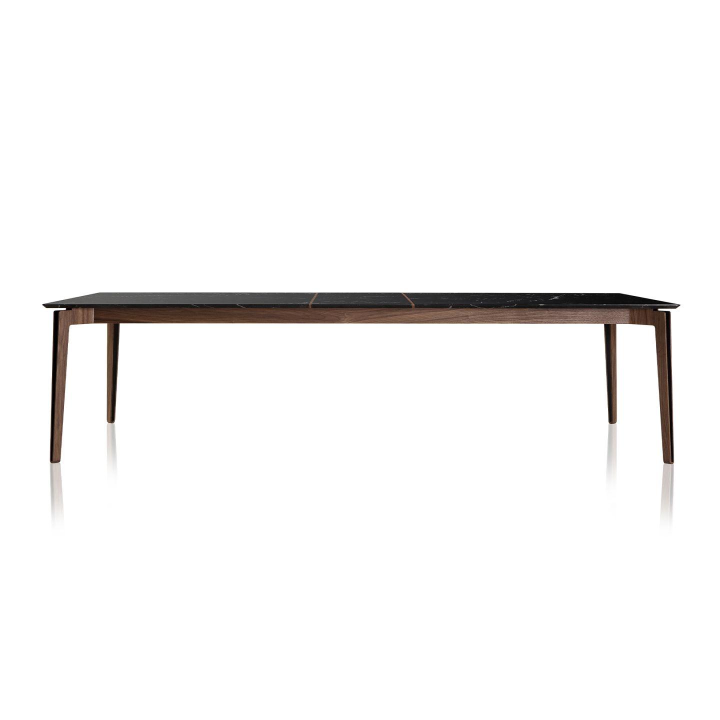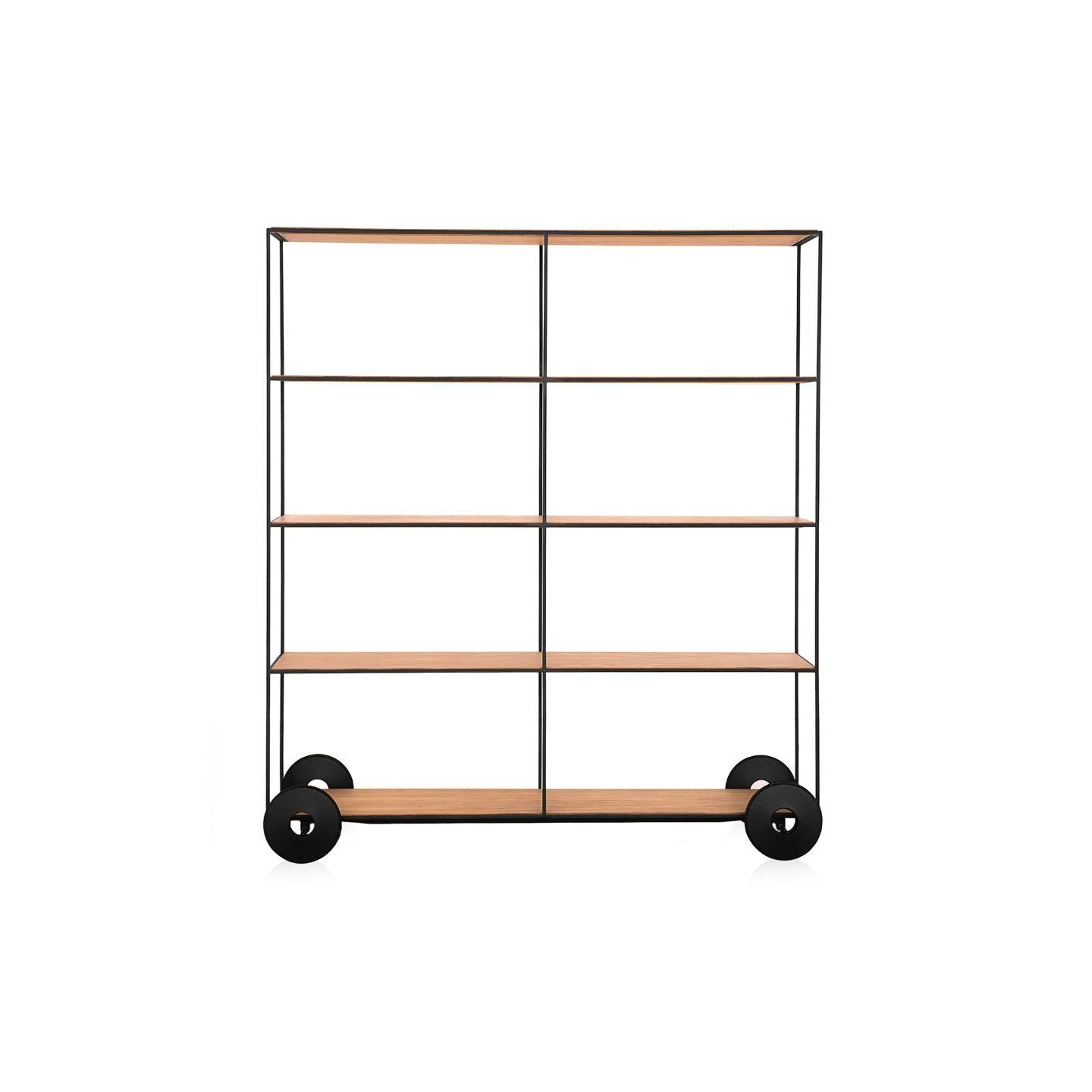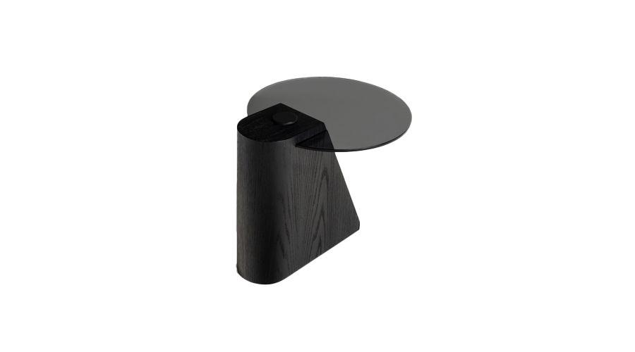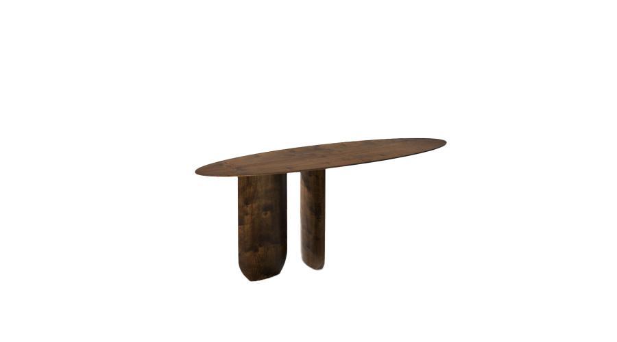 Com uma pegada anos 80, o sofá Lui traz um rigor na sua forma que é quebrado pela assimetria e pela variação dos braços, ora redondo, ora materializado em um generoso bloco retangular. A estrutura do sofá, toda revestida no próprio couro, já oferece o apoio necessário em uma das laterais, fazendo as vezes de mesa em chapa de aço dobrada e revestida com lâmina natural de madeira.