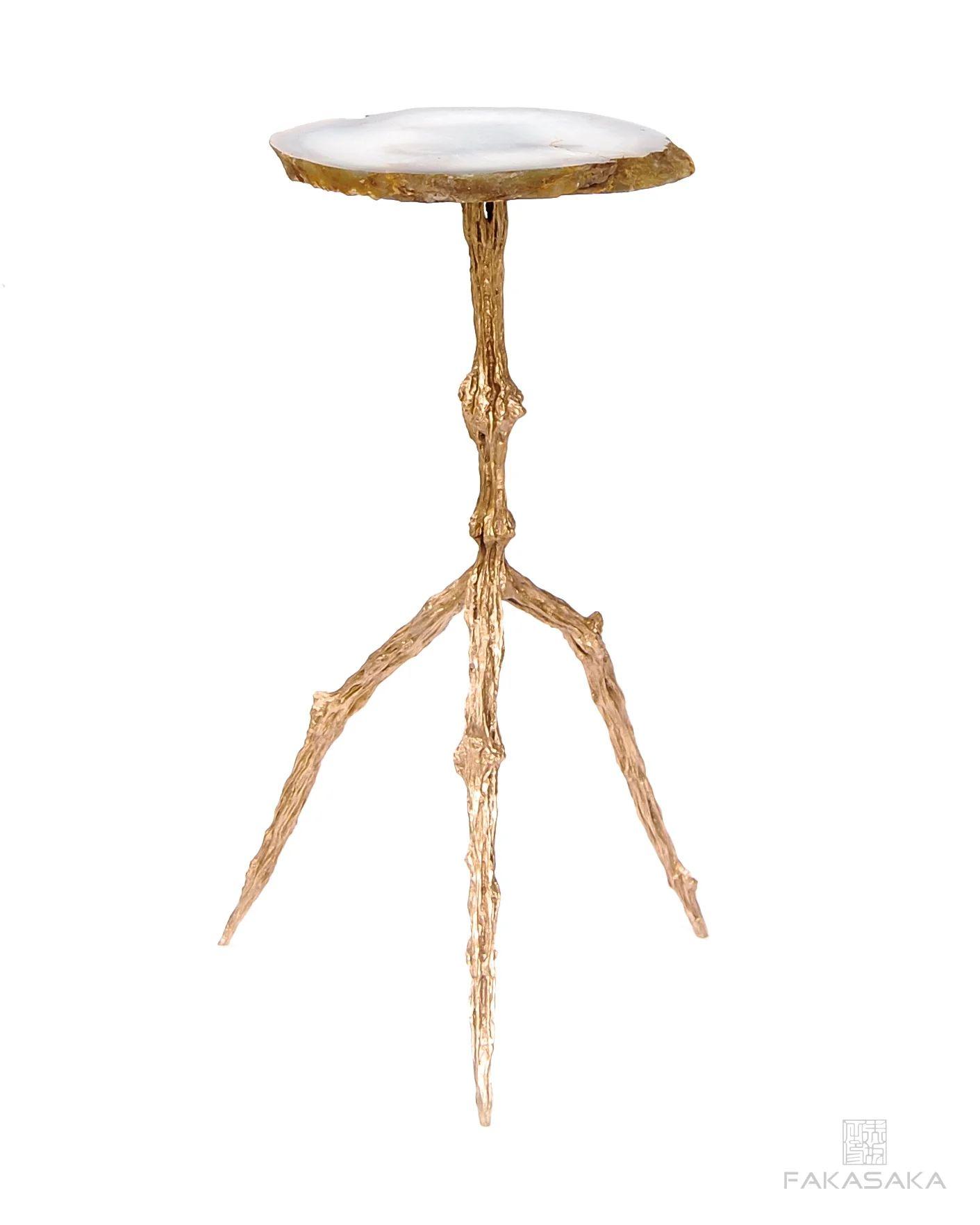 Tecido Fornecido, base em couro, pés pintados no metalizado marrom.