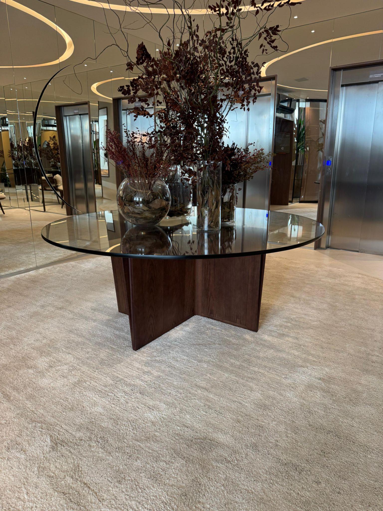 Com design arrojado, a Cadeira Max foi um verdadeiro desafio estrutural. A peça conta com quatro colunas de apoio de madeira sucupira conectadas por eixos de alumínio. A concha, revestida de couro eton - e moldada em fiber glass -, garante a curvatura ideal, resultando em um assento compacto e extremamente confortável.