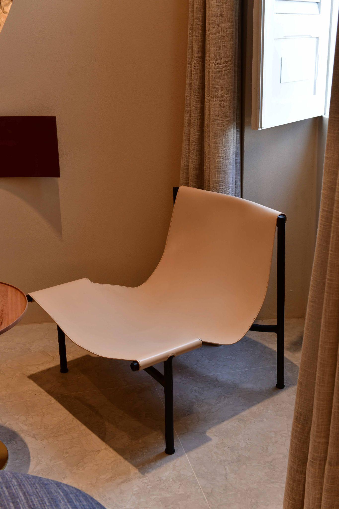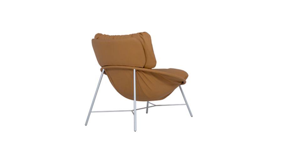 O harmonioso contraste entre as rígidas linhas dos apoios em lâmina natural e o aspecto maleável e orgânico do couro no assento define o design da poltrona Soft, que une conforto e estética.
