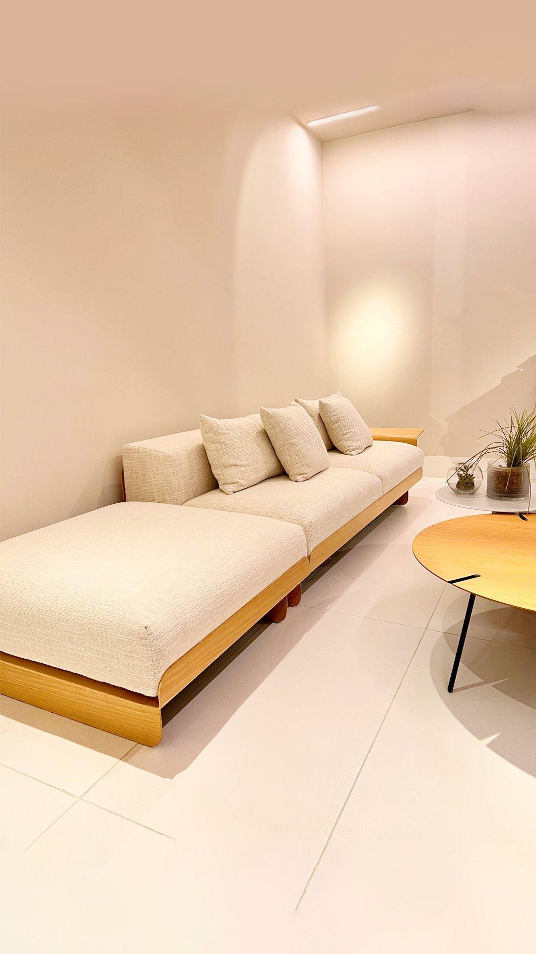 O Sofá Imago nasce da ideia de um mobiliário que acompanha o ritmo do corpo e do cotidiano. Com sistema retrátil, a peça se transforma conforme o uso, adaptando-se aos diferentes momentos de pausa, convivência e descanso prolongado.