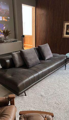 A linha Sela possui estrutura de aço com contenções laterais e encosto de couro culatra de curtume vegetal. Com dimensões reduzidas e excelente conforto, é composto por partes que se acoplam entre si, podendo alcançar grandes dimensões sem transtornos na sua logística. Capas de tecido removíveis facilitam a lavagem e conservação. 240cm