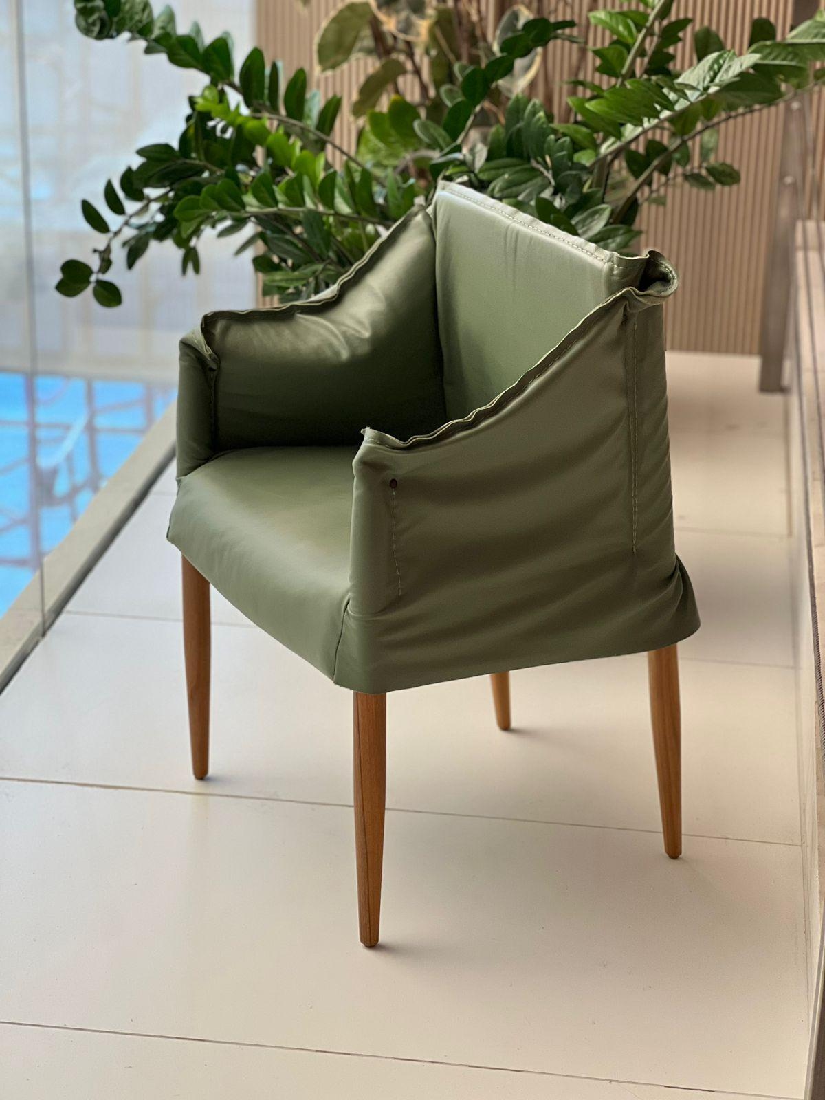 Madeira Canela, estofada em coura olive e pés preto fosco