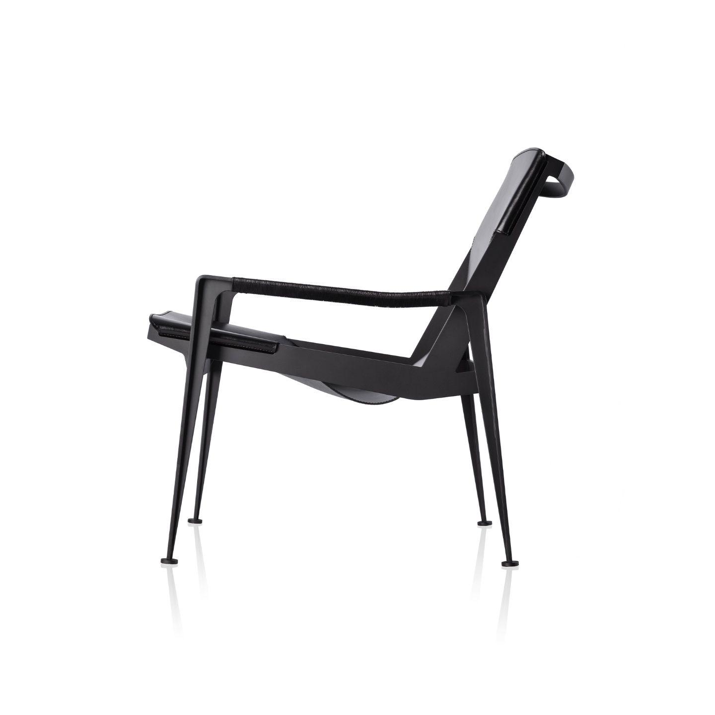 Jet Set, a poltrona amplia o conforto e rigidez por meio da adição de apoios de braço e da extensão de sua base em aço inox.