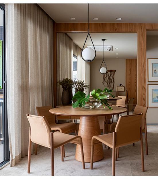 Com formas geométricas e volumes compactos, a Linha Curva se organiza na combinação da madeira com o couro e deixa clara sua função de ergonomia e conforto.