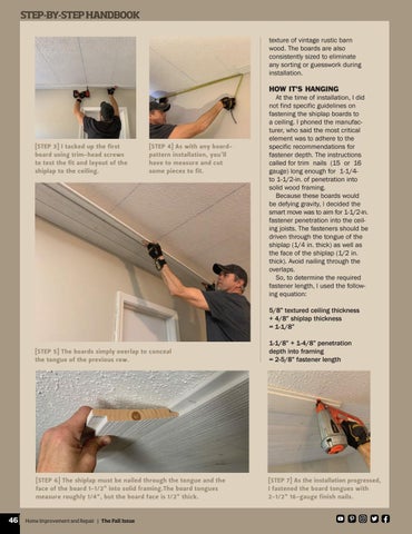 HOW IT’S HANGING At the time of installation, I did not find specific guidelines on fastening the shiplap boards to a ceiling. I phoned the manufacturer, who said the most critical element was to adhere to the specific recommendations for fastener depth. The instructions called for trim nails (15 or 16 gauge) long enough for 1-1/4to 1-1/2-in. of penetration into solid wood framing. Because these boards would be defying gravity, I decided the smart move was to aim for 1-1/2-in. fastener penetration into the ceiling joists. The fasteners should be driven through the tongue of the shiplap (1/4 in. thick) as well as the face of the shiplap (1/2 in. thick). Avoid nailing through the overlaps. So, to determine the required fastener length, I used the following equation: 5/8” textured ceiling thickness + 4/8” shiplap thickness = 1-1/8”
