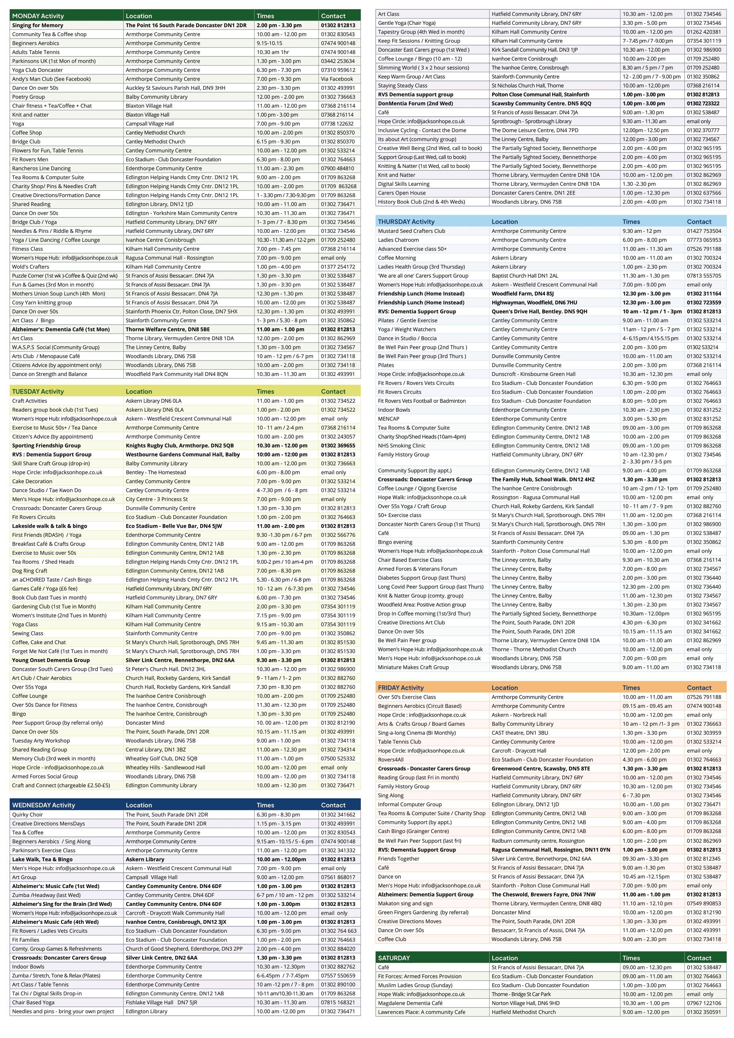 TheKeepinMindserviceispartofAgeUKDoncaster andofferssocialsupportforpeoplelivingwith dementiaandtheircarers.Thisincludescommunity therapyandvarioussocialgroupsaroundDoncaster. Thesetwoservicesworkcloselytogethertoofferwraparound support,bothclinicalandsocial Whicheveryoucontact,wewill ensurethatyouarereferredtotherightteamforthesupportyou require.