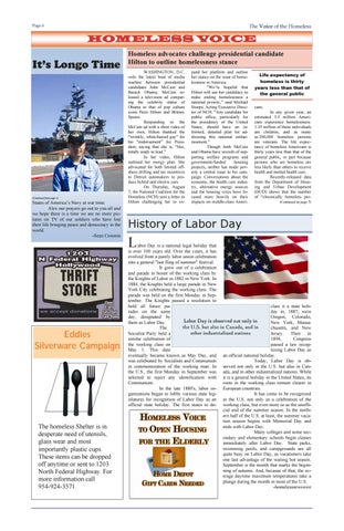 pand her platform and outline her stance on the issue of homelessness in America. “We’re hopeful that Hilton will use her candidacy to make ending homelessness a national priority,” said Michael Stoops, Acting Executive Director of NCH. “Any candidate for public office, particularly for the presidency of the United States, should have an informed, detailed plan for addressing this national embarrassment.” Though both McCain and Obama have records of supporting welfare programs and government-funded housing projects, neither has made poverty a central issue to his campaign. Conversations about the economy, the health care industry, alternative energy sources and the housing crisis have focused more heavily on their impacts on middle-class Ameri-