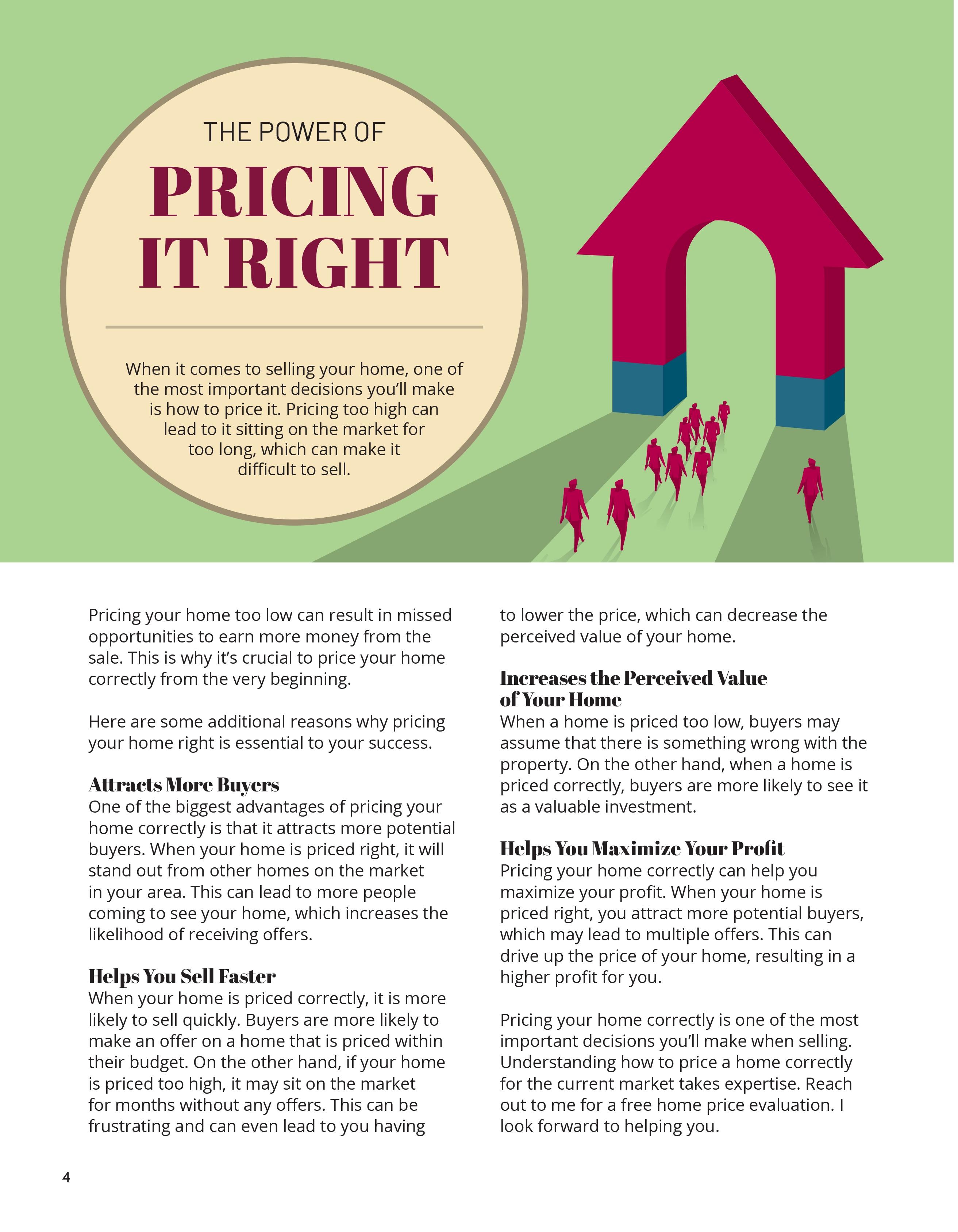 From the start, getting the price right is one of the most important decisions related to getting your home sold for top dollar. I am an expert at determining the best fair market value and pricing strategies to accomplish this goal