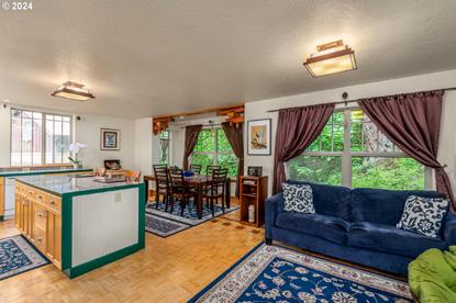 architecture offers great separation of space, with 2BR per wing and an additional two rooms in the upper loft. Large galley style kitchen. Eugene, Oregon. $785,000