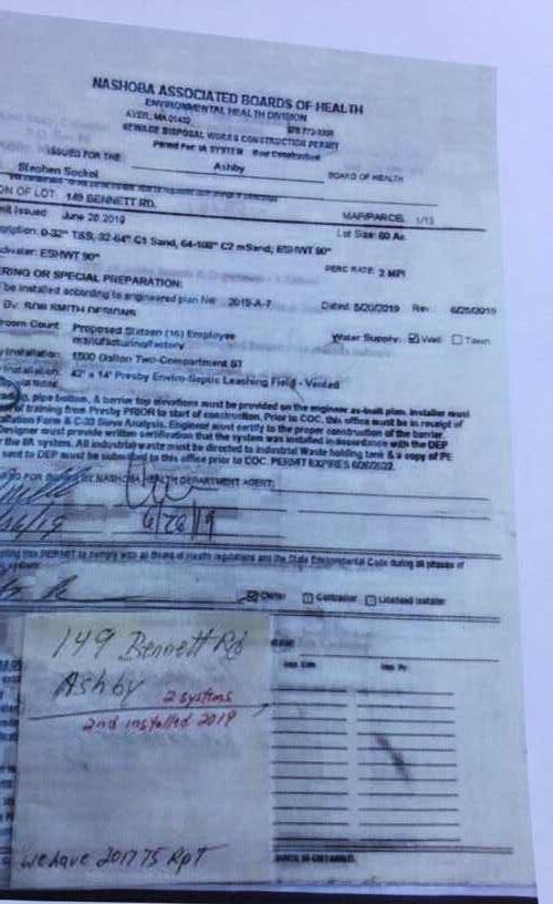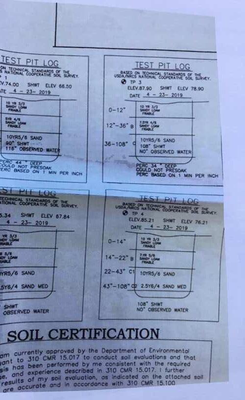 Ashby MA 01431-1 02/14/2022 90” to 108” 5/20/19 Soil testing info dated 4/23/19 on design plan dated 5/20/19 lists ground water from 90” to 108”.