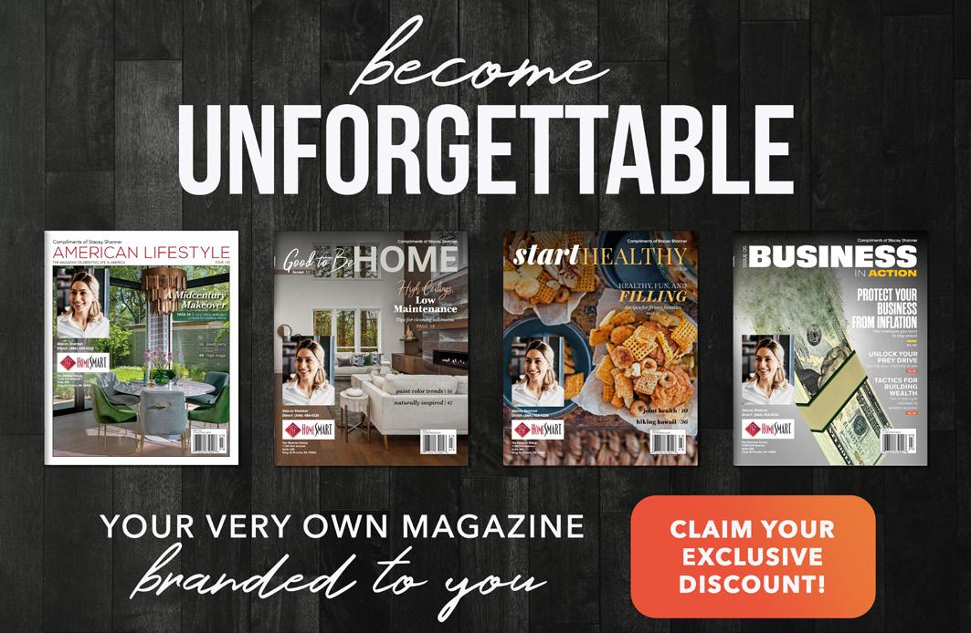 What do you do to stay in touch? Every eight weeks, we mail to your list of contacts a coffeetable quality magazine branded with your photo, business and contact information in six key places. In it, your clients find entertaining articles, beautiful images and savable, shareable tear-out cards with valuable information like DIY tips and recipes.