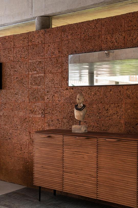 The building's architectural form holds significance and interest throughout the entire exterior of the house, primarily reflecting the internal volumes and offering hints about the interiors. In contrast to the sinuous and expressive walls featured in 'The Running Wall Residence,' designed by the architects for the homeowner's brother, the exposed laterite walls in this residence exude a robust and solid presence throughout the project It projects from the building in places forming recesses within the landscape, providing seclusion and privacy.