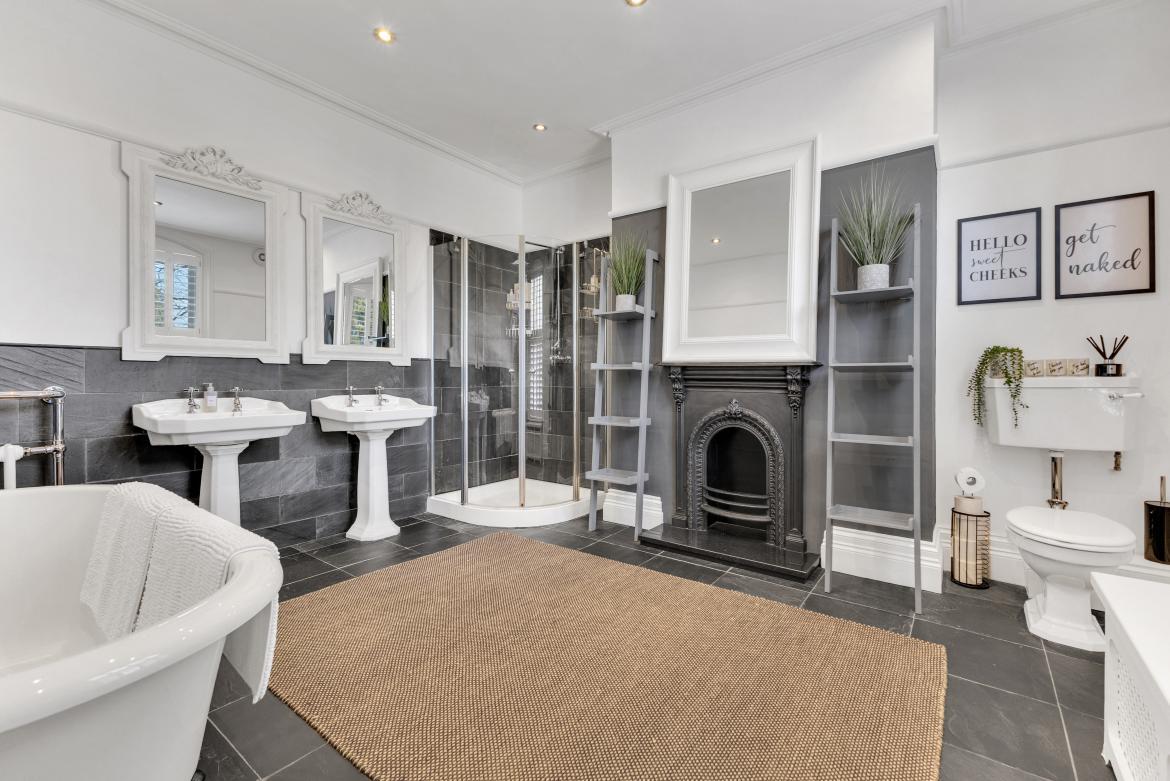 Superb master bedroom with spacious en-suite comprising free-standing bath, corner shower and dual sinks. Further double bedroom with en-suite shower room.
