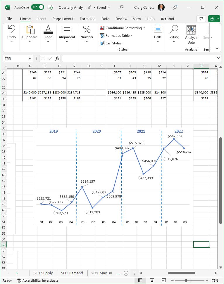 Demand is slowing but is still strong. Supply has risen in the past two quarters, but still remains at 30% below pre pandemic levels. Yet new listings to market have slowed as homeowners struggle with consumer confidence in the economy. Supply levels are not expected to go back to pre pandemic levels anytime in the foreseeable future. The Pre Hurricane Ian level of demand in Sarasota / Bradenton today is similar to that of 2019 which was a great year by normal standards.