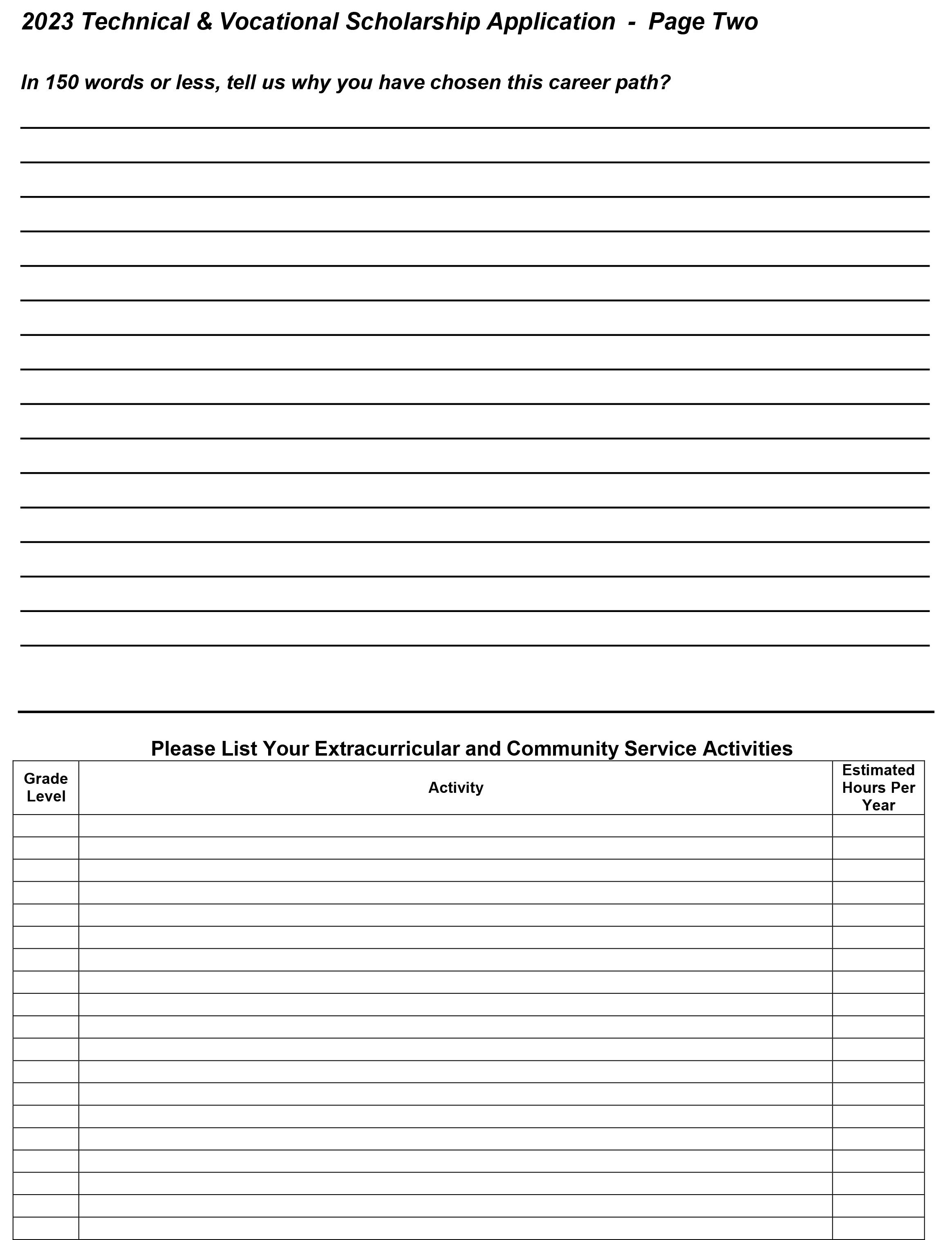 Mail the recommendation letter, all pages of this application, and the student’s transcript of grades to the address below postmarked on or before before March 17, 2023