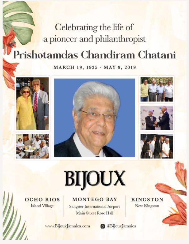FondlyknownasPishuChandiram,hewasborninKingston,Jamaica onMarch19,1935.PishuattendedCampionHallPrimarySchooland laterSt.George’sCollegefromwhichhegraduatedin1951.After graduation,hejoinedhisfather’sbusinessandwastransferredto MontegoBaytoopenitsfirststorenamedIndiaHousein1953.Anew buildingwasbuiltjustoppositethe#1PostOffice,andtherethename ofthestorechangedtoBijouxJewelers.Bijouxhasgoneontobecome oneofthemostsuccessfulDuty-FreeJewelryoperationsin TheCaribbean.