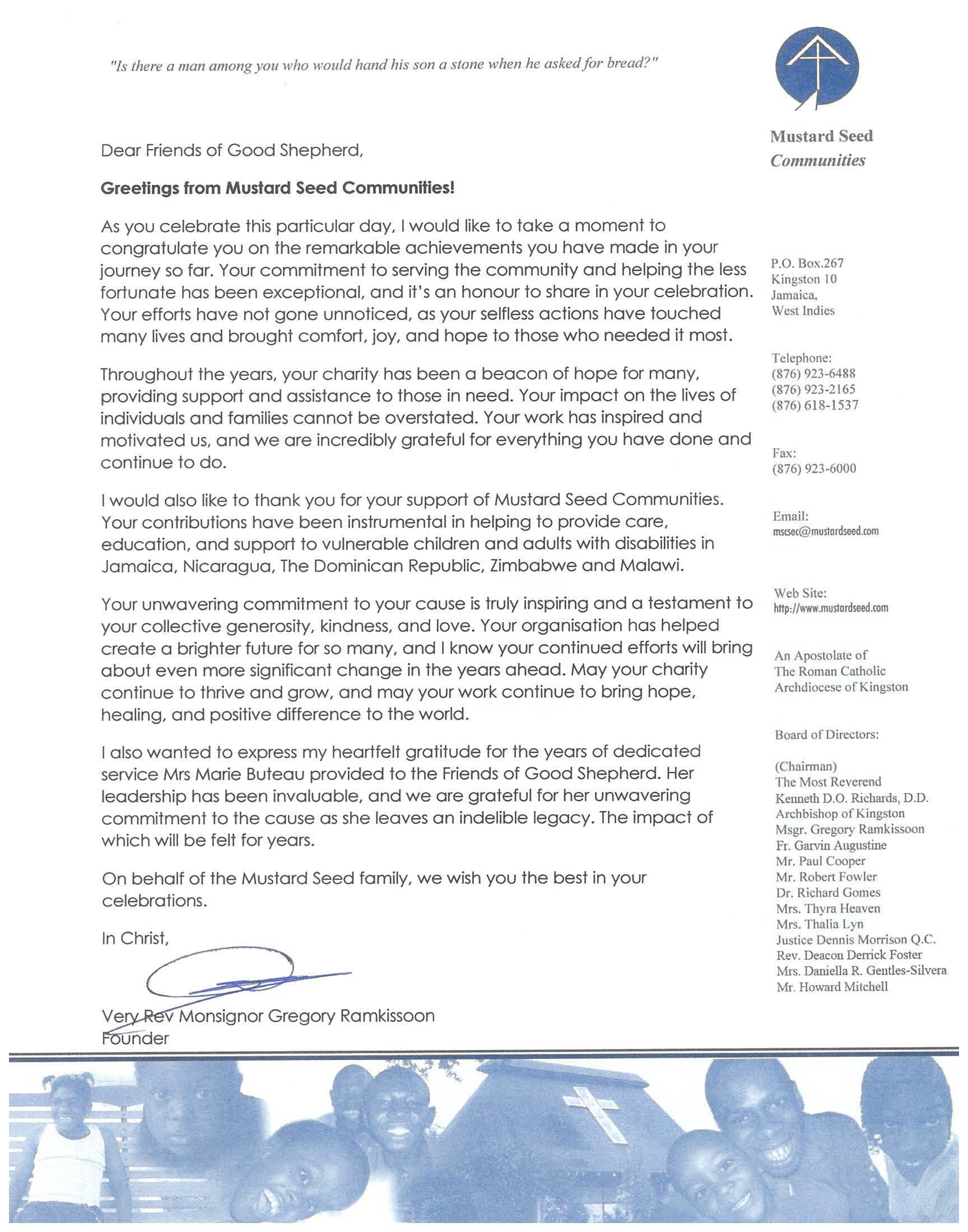 FriendsofGoodShepherdInt’l.Inc.isverygratefulforthe integralpartMr.Maffessantiplayedintheconstructionof theGoodShepherdFoundationMedicalComplexin MontegoBay,Jamaica.HeservedasChairmanofthe ManagementBoardandDirectoroftheExecutiveBoard oftheGoodShepherdFoundationformanyyears.Wewill dearlymissthehumanitarianweknewhimtobe.