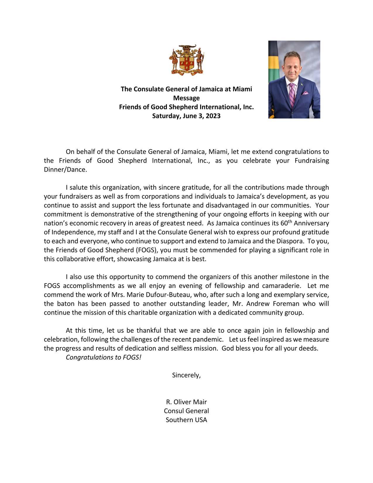 One shining example is her role in the establishing and sustaining of The Friends of Good Shepherd (FOGS), an organization that she founded and headed for over twenty-six years to complement a charitable organization of that name that I had established in Jamaica.Herexceptionalorganizational strengthtranslatedintoannualinspiring fundraising functions which raised wellneeded funds and enabled the provision of invaluable services in the areas of health, education, and social distressinJamaica.