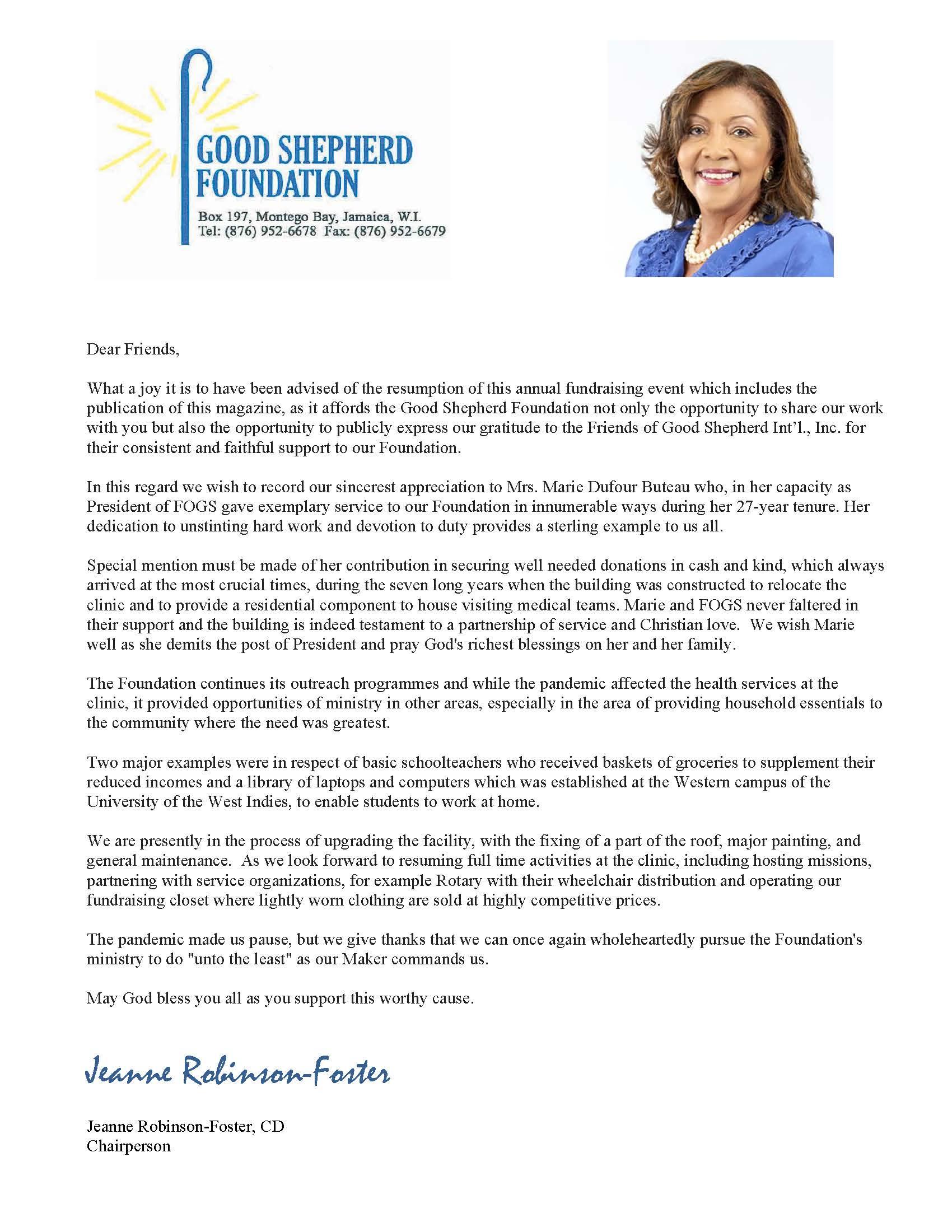 Twenty-sixyearsofselflessservicetoa noble cause such as the Friends of Good Shepherd International Inc., (FOGS),isnoordinaryaccomplishment. Therefore, it is with profound gratitude that we acknowledge and commend Marie Buteau for her leadership and visionovertheseyears.
