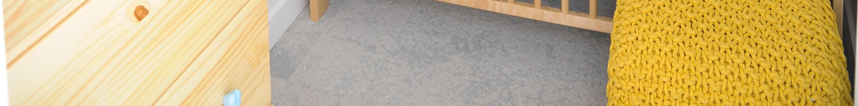 The couple enjoy whimsical touches, thus the wallpaper and “cloud” light fixture. A favorite feature in this room is the wallpaper that stretchs up on to the ceiling above the crib! Because of the small space, this extra splurge fit nicely into the budget. Using low VOC recycled carpet tiles on the floor and toys and clothes they already owned as accessories also help to keep the budget reasonable.