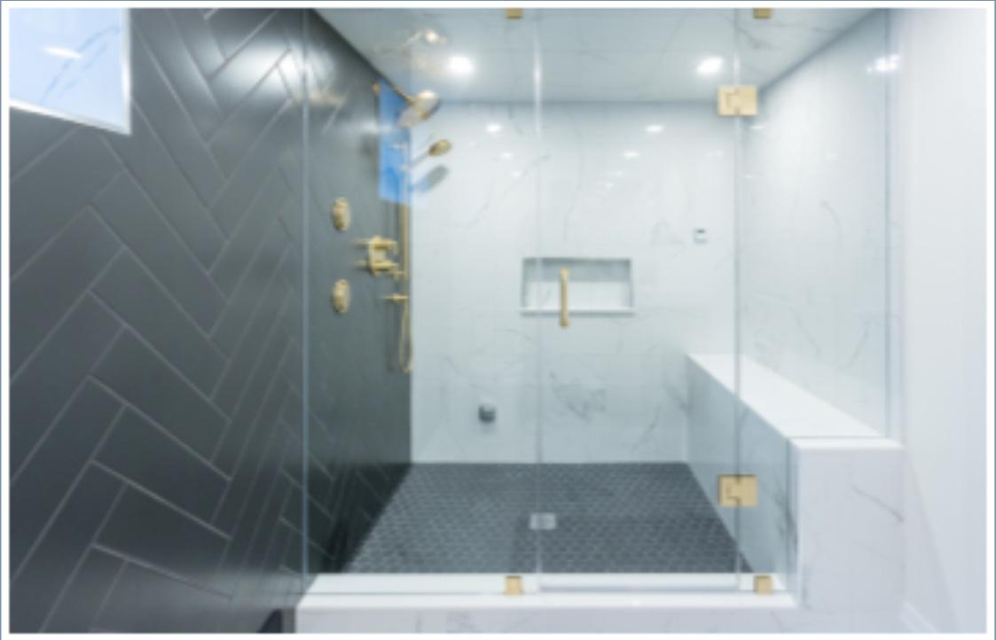 make room for a bigger TV, the fireplace was located on a different wall. This allows the homeowners to enjoy both features without compromising on either or cluttering up a single wall. The owner likes to workout so naturally a gym space was part of the design and a steam room is the perfect complement to the gym. To make this work, the bathroom houses a shower that doubles as a steam room as well. A black feature wall starts in the shower and continues into the bathroom to blend the shower into the space instead of having it look separate. The bathroom is finished in a mix of white tones, gold accents and a wood vanity that makes the space both trendy and functional. It's the perfect spot to unwind after a great workout!