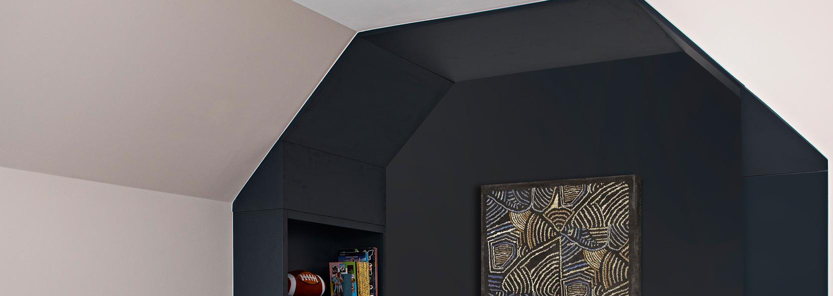 thinking can lead to a space that goes above and beyond. When designing this basement for a family of four, Designer Gabriele Pizzale turned a small nook into a highly functional space that offers storage, a quiet place to curl up with a good book and an extra bed for overnight guests. We love the use of a dark color to highlight the space, adding a bit of drama to the room while at the same time, creating the feeling of a separation between the bed and the activity in the rest of the room. This, combined with soft, welcoming textures in the linens, create a space that welcomes you in to relax and unwind.