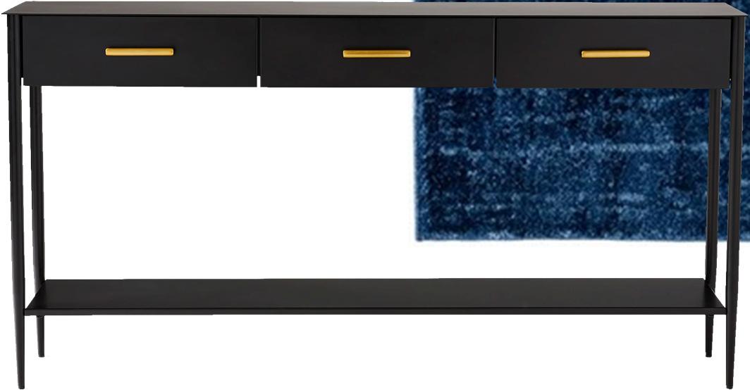 With the goal being to allow the artwork to be the focal point of the space, we selected furniture, a mirror and lighting in black finishes to create contrast without competing with the colors in the artwork. Black and white can become very harsh, so we softened the look with a runner in a deep blue that brings in a subtle touch of color and warmth.