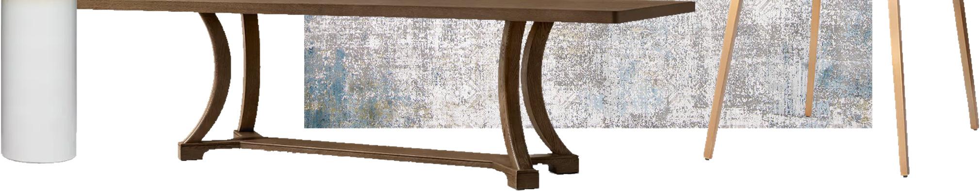 For the main furniture pieces in the room, we selected a darker wood tone that would add warmth and depth to the space while still remaining earthy and neutral. Gold accents on the chairs, mirror, buffet and light fixture bring a touch of luxury to the overall look. We selected softer gold tones that play well into the earthy feel of the space. For the chairs, we selected a deep blue fabric that adds a punch