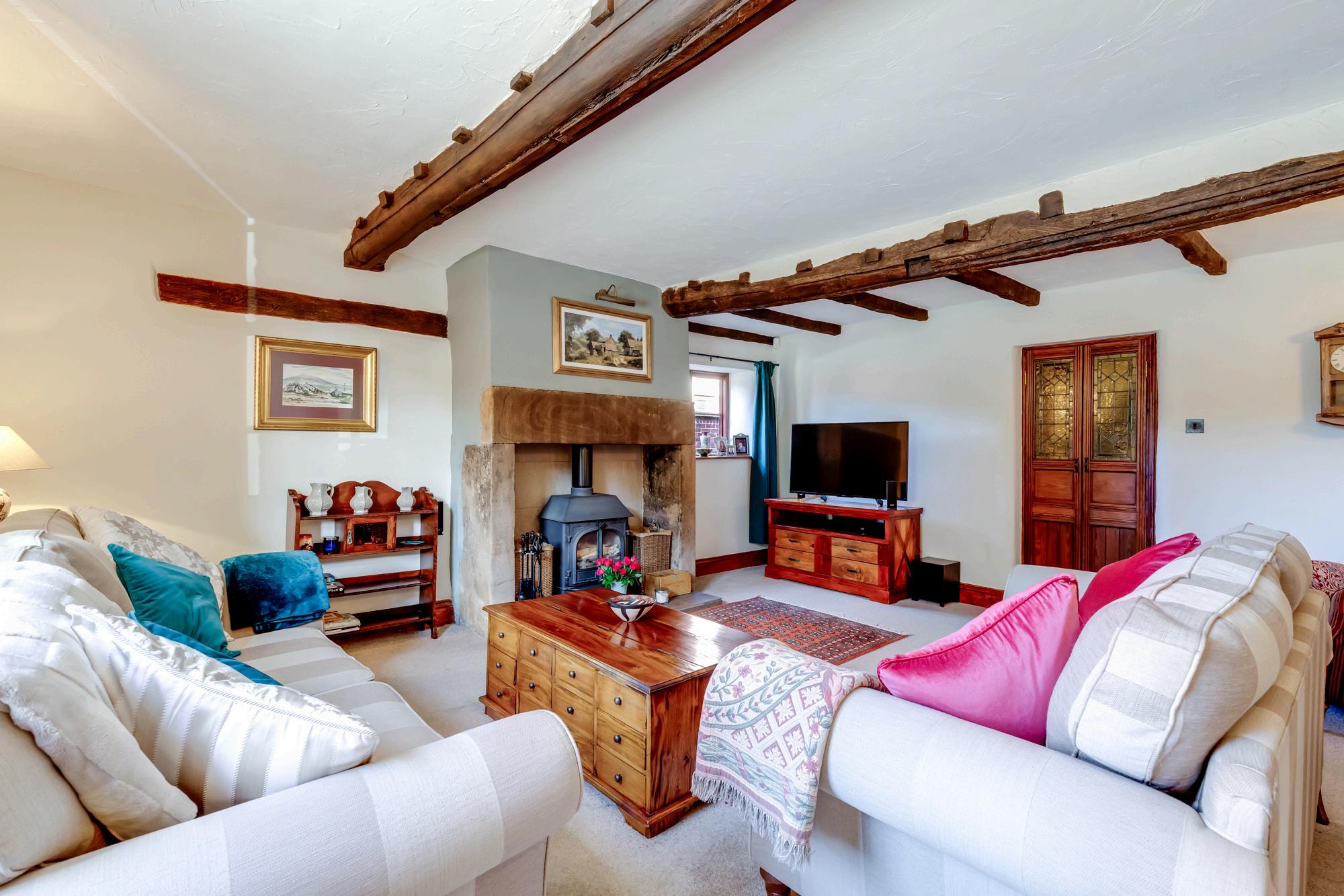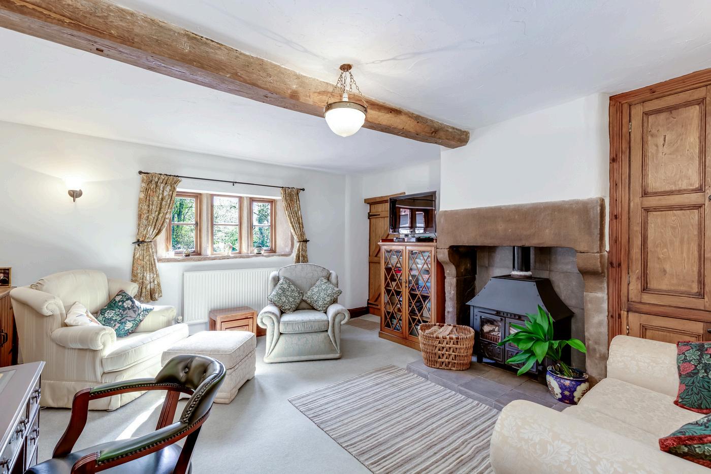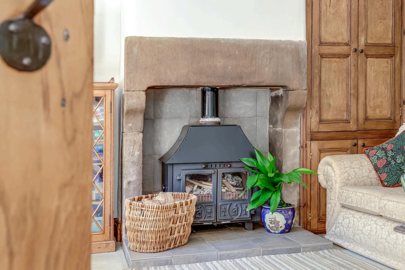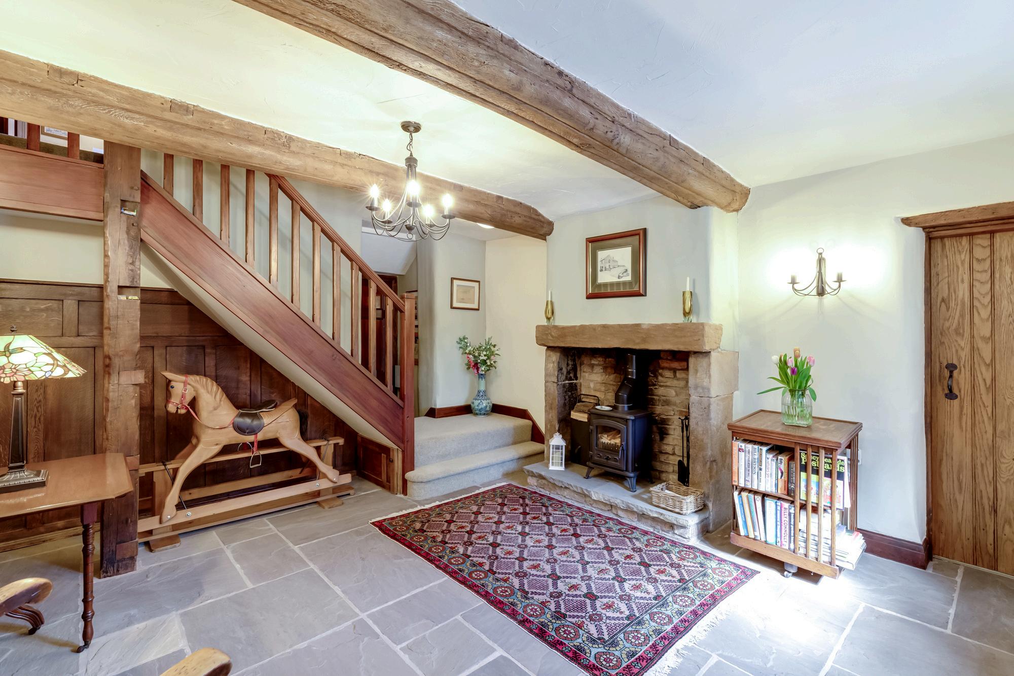 The gate opens to the gravelled driveway which has ample parking and leads both to the detached double garage and to the main entrance draped with wisteria, a gorgeous scent to greet you when in flower. Step into the welcoming hallway with flagged stone flooring and multi fuel stove.