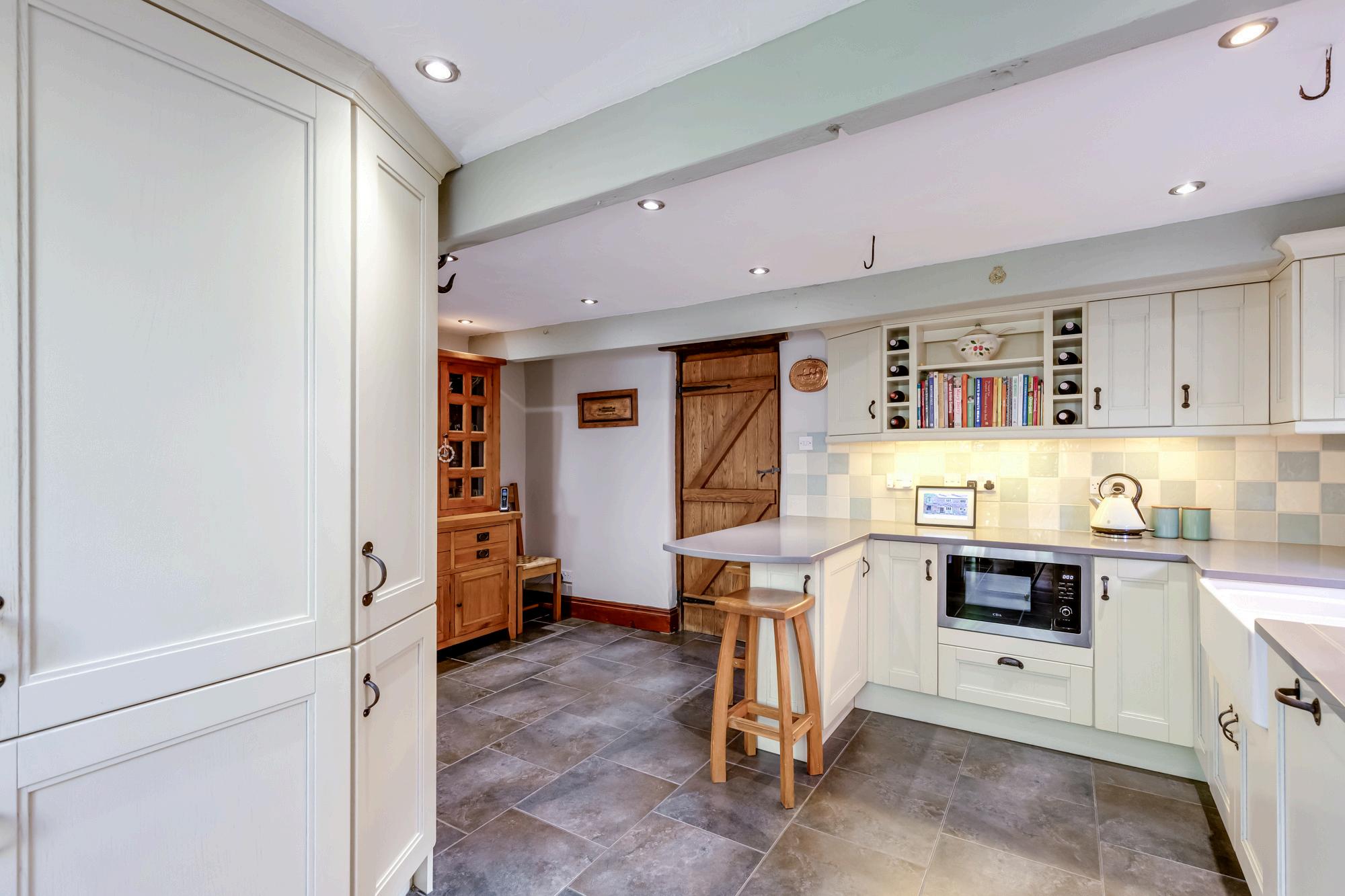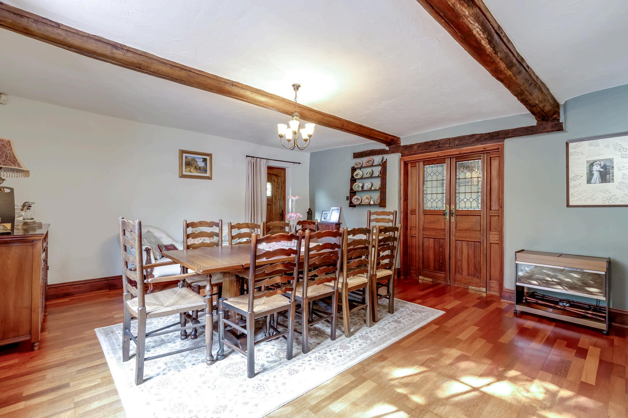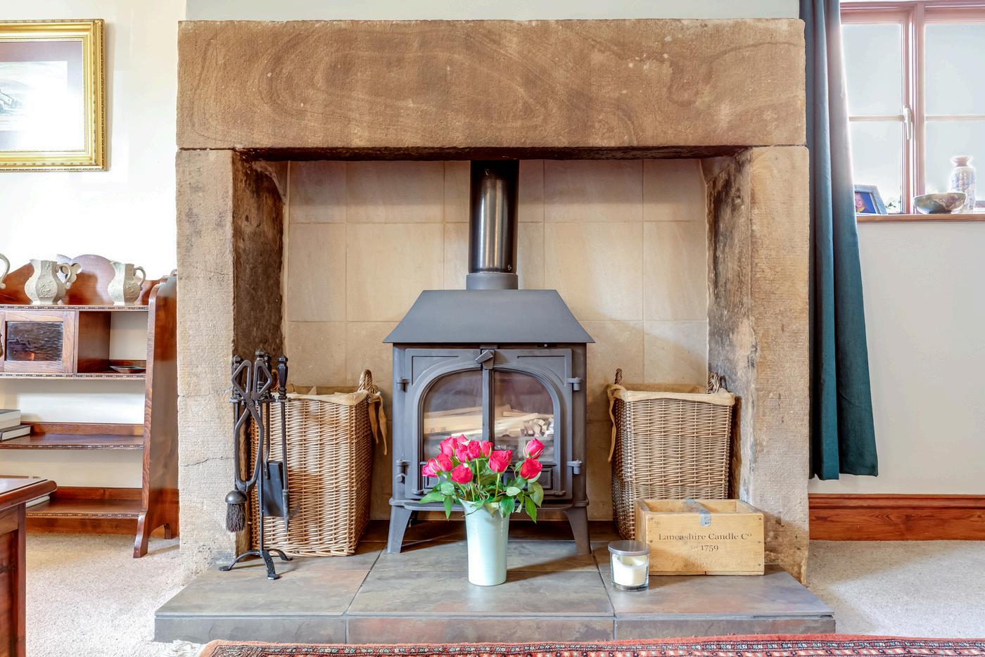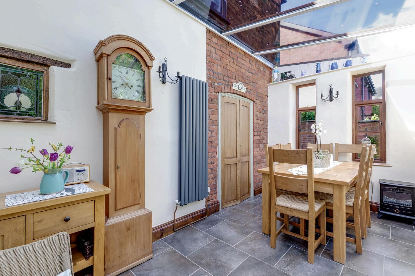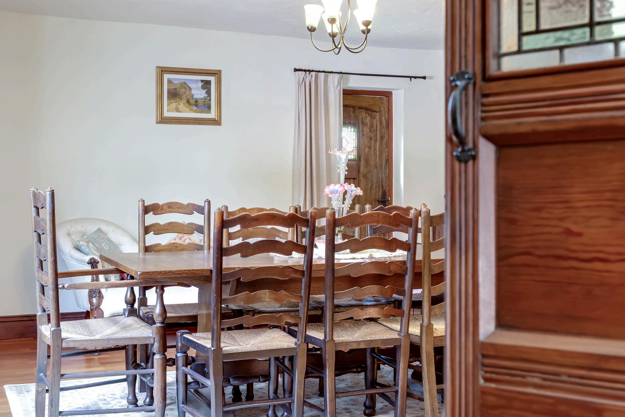 The gate opens to the gravelled driveway which has ample parking and leads both to the detached double garage and to the main entrance draped with wisteria, a gorgeous scent to greet you when in flower. Step into the welcoming hallway with flagged stone flooring and multi fuel stove.