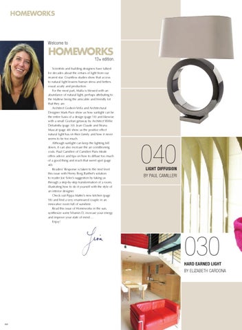 Scientists and building designers have talked for decades about the virtues of light from our nearest star. Countless studies show that access to natural light lessens human stress and betters visual acuity and production. For the most part, Malta is blessed with an abundance of natural light, perhaps attributing to the Maltese being the amicable and friendly lot that they are. Architect Godwin Vella and Architectural Designer Mark Pace show us how sunlight can be the entire basis of a design (page 18) and likewise with a small Gozitan getaway by Architect Willie Debatistta (page 30). Jean Claude and Strana Muscat (page 48) show us the positive effect natural light has on their family and how it never seems to be too much. Although sunlight can keep the lighting bill down, it can also increase the air conditioning costs. Paul Camilleri of Camilleri Paris Mode offers advice and tips on how to diffuse too much of a good thing and reach that sweet spot (page 40). Readers’ Response is taken to the next level this issue with Henry Borg Barthet’s solution to reader Joe Soler’s suggestion by taking us through a step-by-step transformation of a room, illustrating how to do it yourself with the style of an interior designer. Check out Pippa Mattei’s new kitchen (page 58) and find a very enamoured couple in an innovative room full of sunshine. Read this issue of Homeworks in the sun, synthesize some Vitamin D, increase your energy and improve your state of mind…. Enjoy!