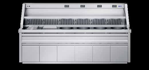 HAKTO frituurbakwand met bain-marie, bakplaat en 4 frituurketels met lage afzuiging, voorzien van frites voorraad bak.