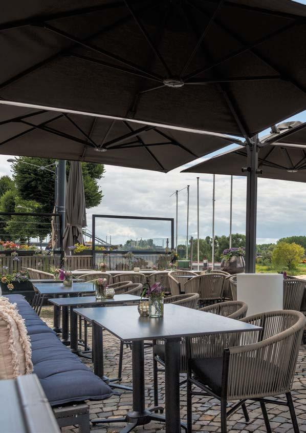 Dit prachtige terras ligt voor de twee panden en bestaat uit twee delen. Het eerste deel van het terras bevindt zich tegen de gevel van de panden aan. De vier blauwe fauteuils aan het begin van dit terras zijn echte eye-catchers. Het andere deel van het terras bevindt zich aan de overkant van de weg tegen de waterkant aan. Hier vallen de parasols en de grote stamtafels voornamelijk op.
