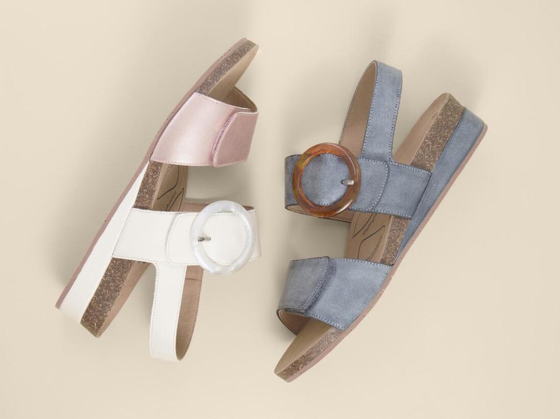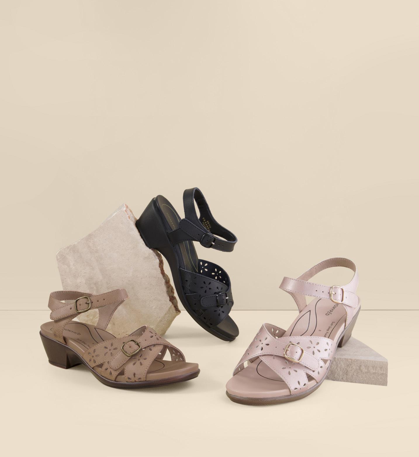 TRIO Frost, Navy SIZE 5-11 h 7.5-9.5 WIDTH D Extra Care Footbed $159.95 | DREAM Navy Blue, Black SIZE 5-11 h 7.5-9.5 WIDTH E Extra Care Footbed $159.95 | US SANDAL Birch, Rose Gold, Black SIZE 5-11 WIDTH D Soft Step Footbed $99.95