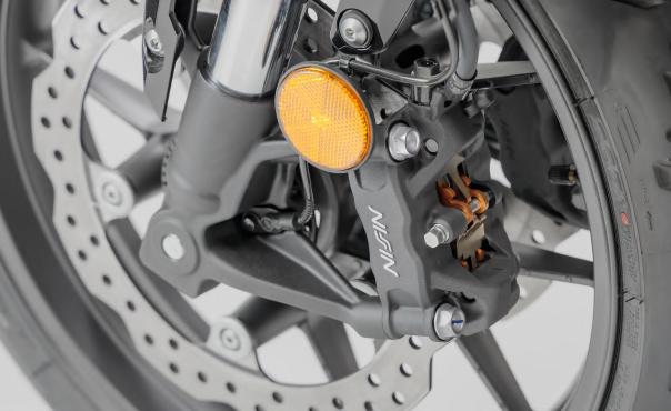 Con respecto a su sistema de frenos, este modelo cuenta con freno delantero de disco de 310 mm y trasero de disco de 240 mm con pinzas Nissin, junto con un sistema ABS de dos canales para mayor seguridad.