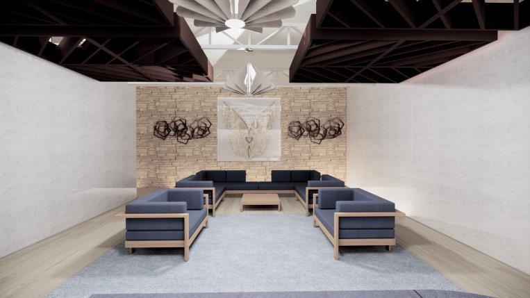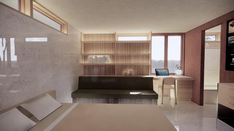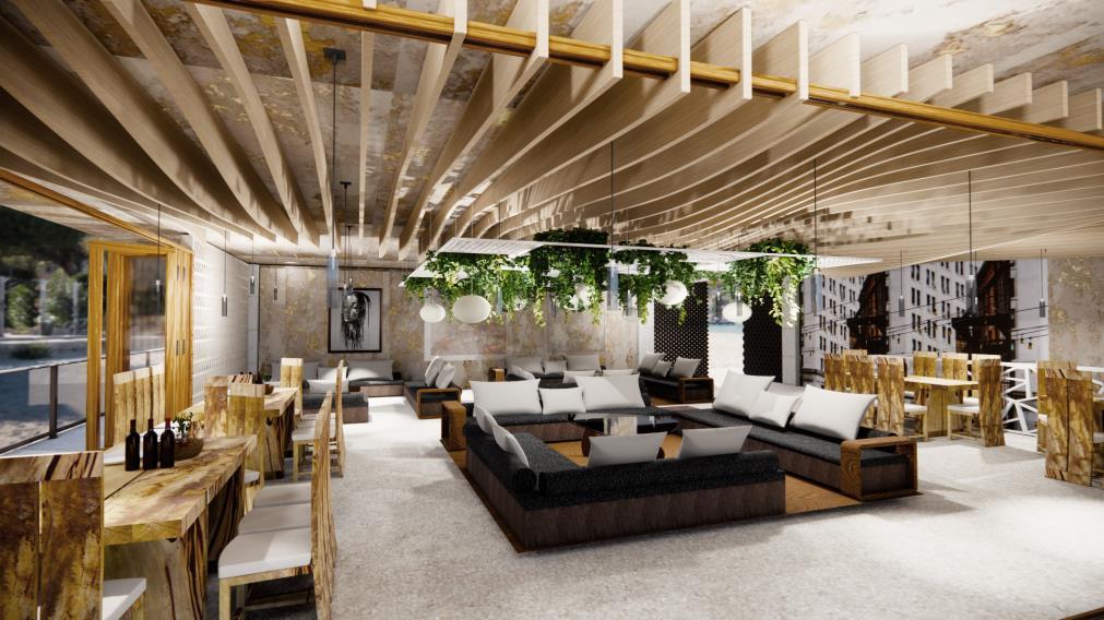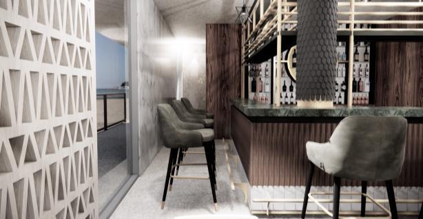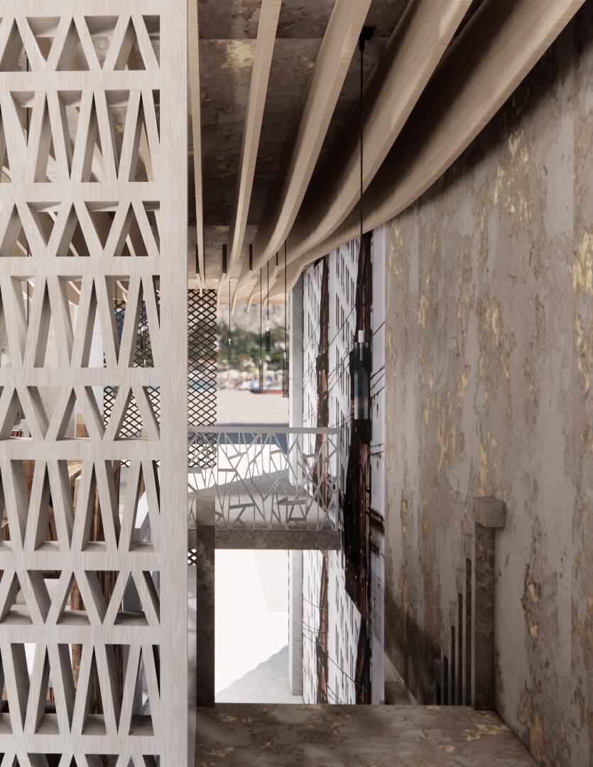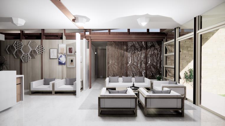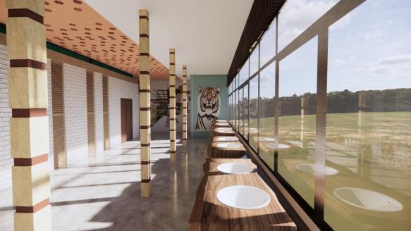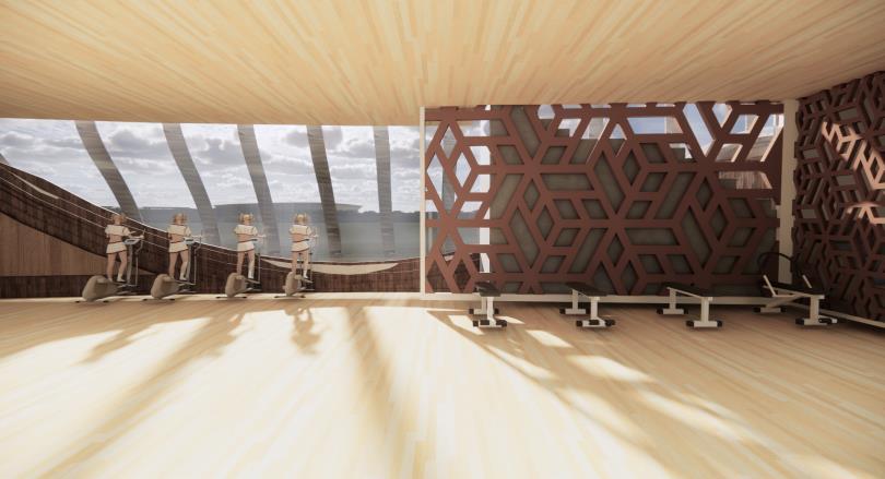 For the interior, my inspiration was the hawksbill sea turtle, its shell texture which is a golden brown and golden yellow design with unique patterns that creates a complementary impact to the overall design. I have also used coconut shell in the interior Tiles made from Coconut Shells are considered one of the newest trends in the Eco- Friendly materials which are sourced directly from the environment.