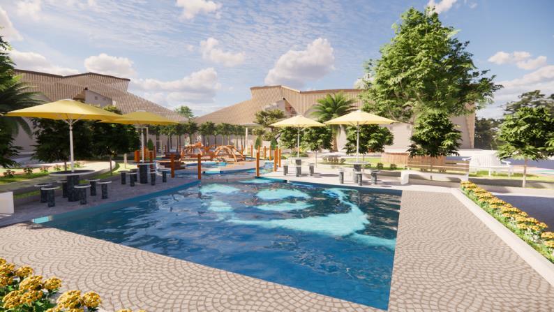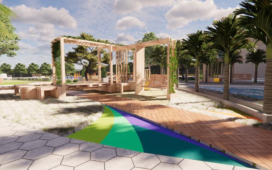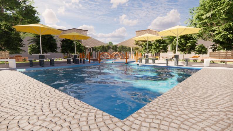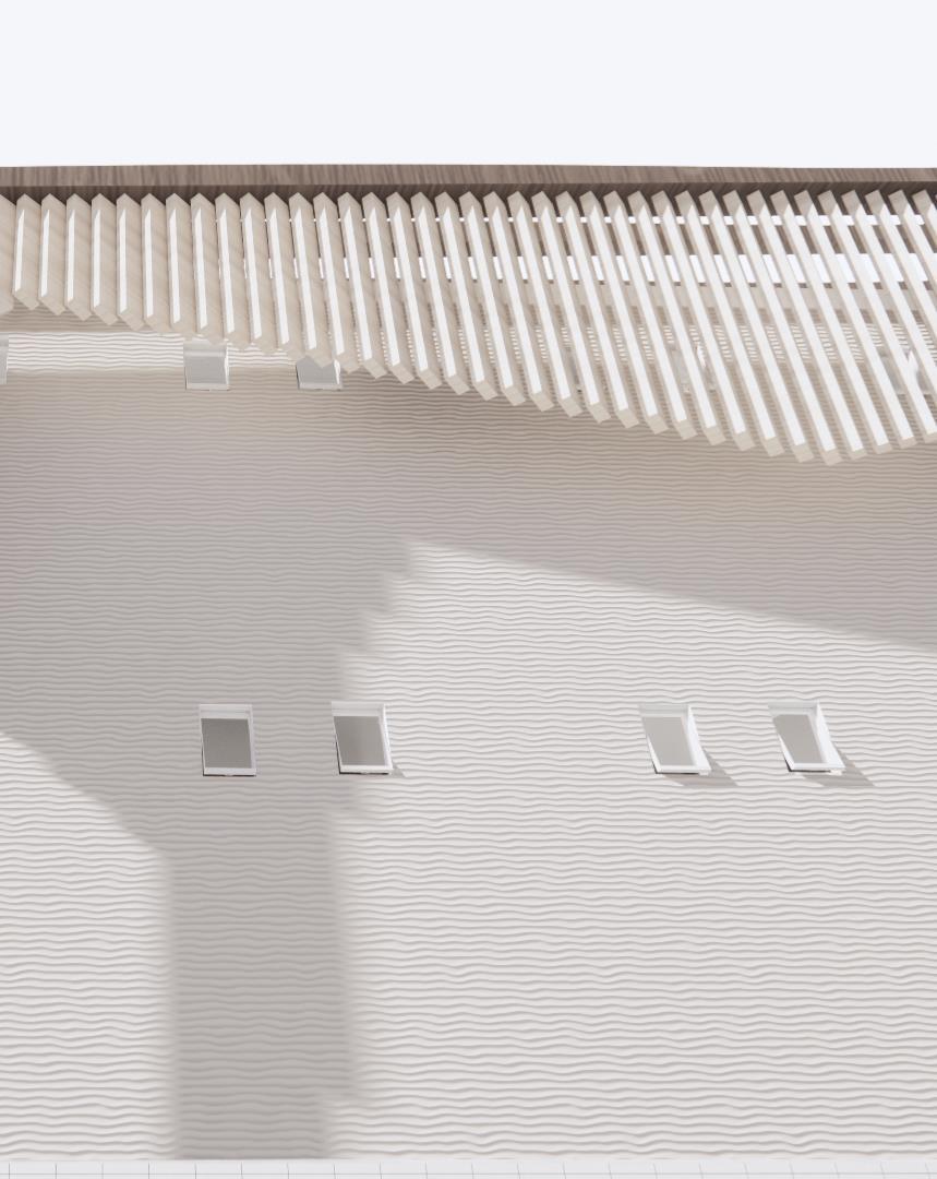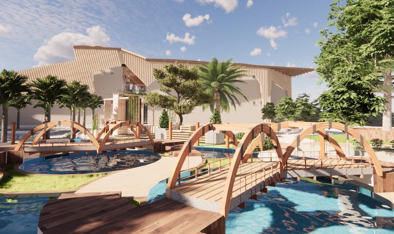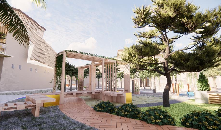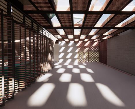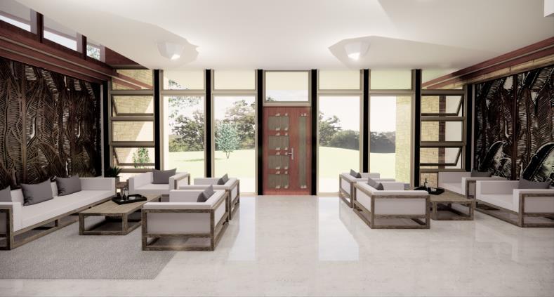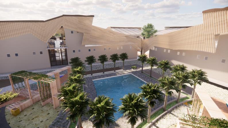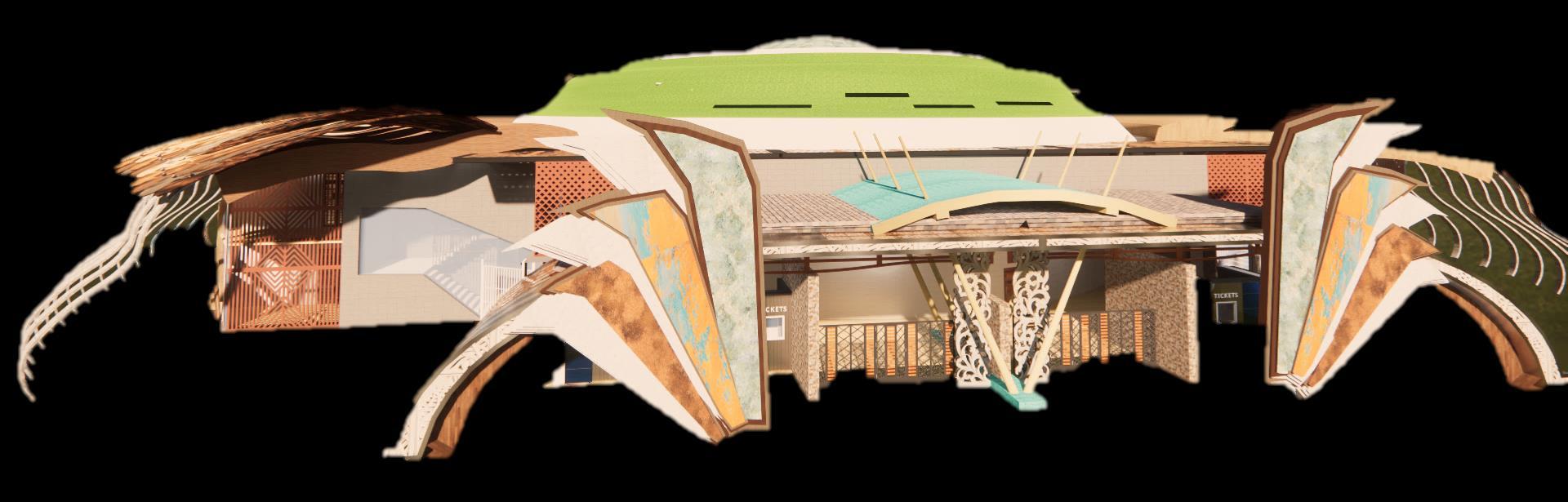 For the restaurant, the form of the roof manipulated Bahay Kubo roof I manipulated the common thatched roof of the Bahay Kubo a half rectangular and half hexagonal shape. So, in this kind of roof, air can easily enter, it provides a clear and comfortable space as well as it gives a good amount ventilation and enough amount of lighting to luminate the area Aside from the space, air and shading it also dealt with the future typhoons in which if typhoons occur or strong winds happens the air will just directly revolve around the roof For the walls, I have used concrete louvered walls for the air to circulate and light to enter, weave pattern walls to complement the with the concrete and it abundant in San Vicente, and a glass for modernity of design materials used are lightweight at the same time it is abundant on the area like these natural stones, vertical wood plank support, coco lumber, low e glass and native plants.