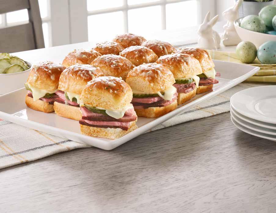 Honey Baked Ham ® and cheddar cheese on mini Southern-style buttermilk biscuits, topped with our savory Garlic Herb Butter and Sweet Honey Glaze Sauce. Bake for 20 minutes.