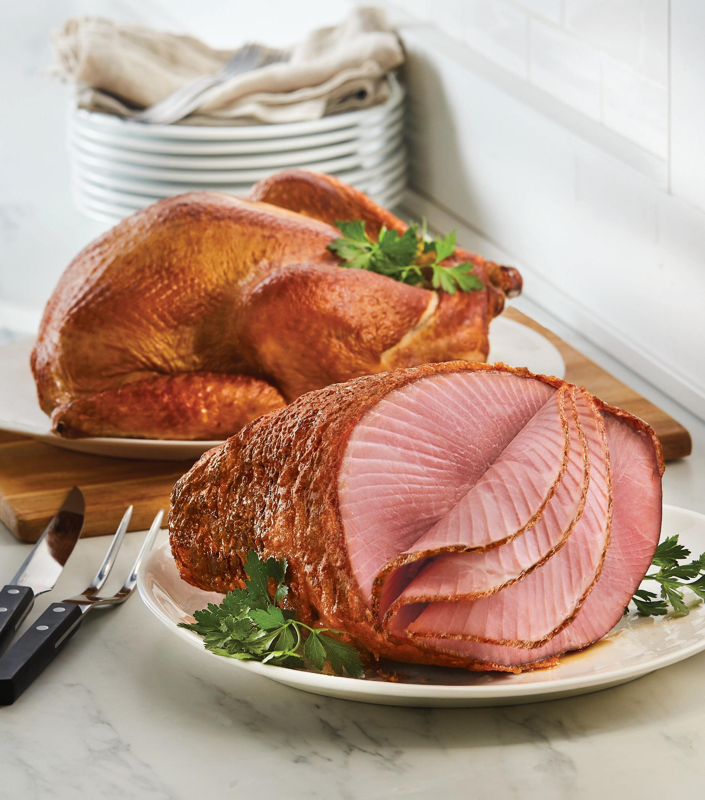 The essentials to build on for a family meal or inviting, casual buffet: our signature boneless ham and tender turkey breast are both slowsmoked to perfection and finished with a sweet, crunchy glaze.
