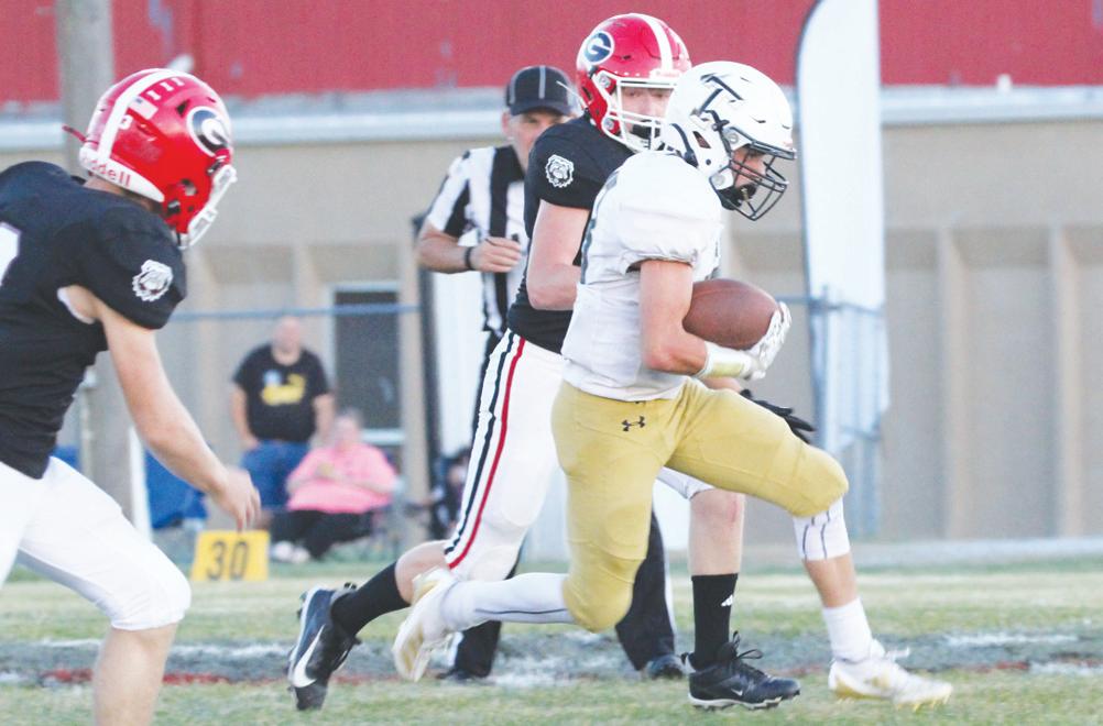 Trenton's Cooper Houser running the ball. Gallatin 25 Levi Carder, and Case Chrisman. Submitted by Macon Schweizer