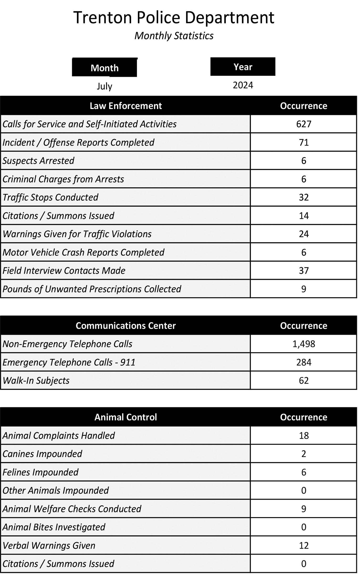 Amy Ridenour Valeka, of Trenton, was arrested by RPD on August 21,2024, charged with Felony D endangering the welfare of a child creating substantial risk-1st degree-1st offense-no sexual conduct and two misdemeanor charges for Violation of a Child Protection Order and Assault-4gth Degree-pursuant to subdivision (3). She was charged on August 22, and will go to Division II court on August 27, 2024 at 9:00 AM. She is ordered held on $25,000 cash only bond. Hayden O. Griffin, 23, of Trenton was arrested on August 21 by TPD, charged with Misdemeanor A Violation of Order of protection for an adult, Misdemeanor B Peace Disturbance-first offense, and Misdemeanor B Trespass-1st offense. The defendant was ordered held on $10,000 Cash Bond, ordered to have no contact with the victim, with bond supervised by NMCS. He has been referred to Division II Court and will go to court August 27, 2024 at 9:00 AM.