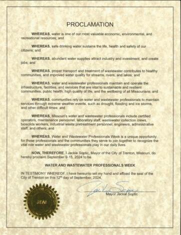 This will commence at 8:00 am, September 18, 2024. If there are questions or concerns, please contact the Water Treatment Plant at (660)359-3211.