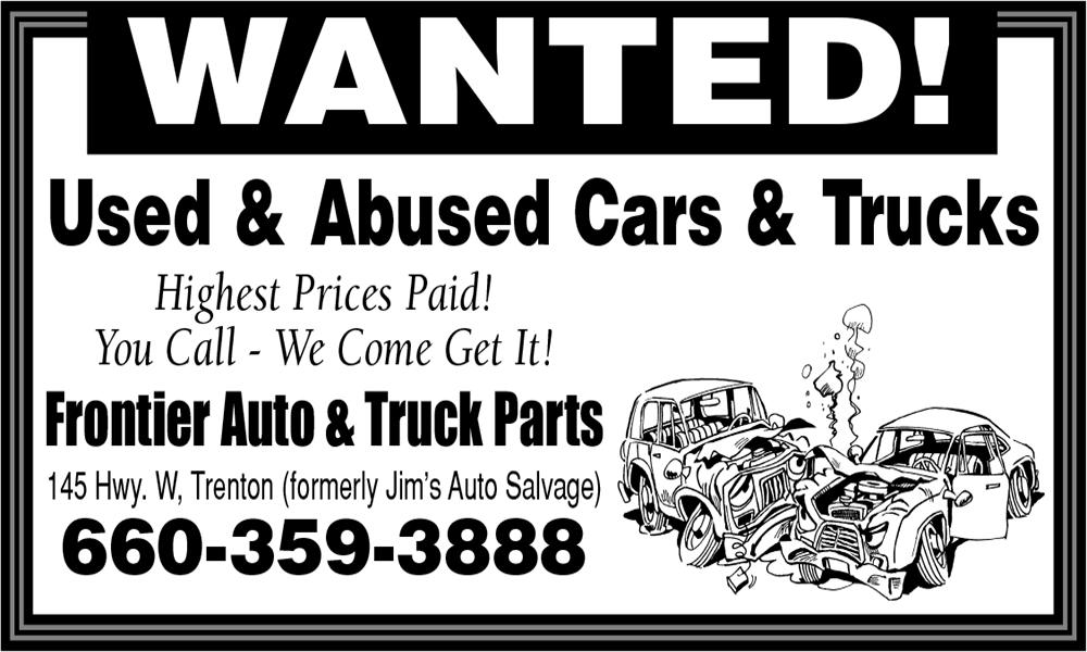 WANTED!! Used & Abused Cars & Trucks, Highest prices paid! You Call - We Come Get It! FRONTIER AUTO & TRUCK PARTS, (formerly Jim’s Auto Salvage). 145
