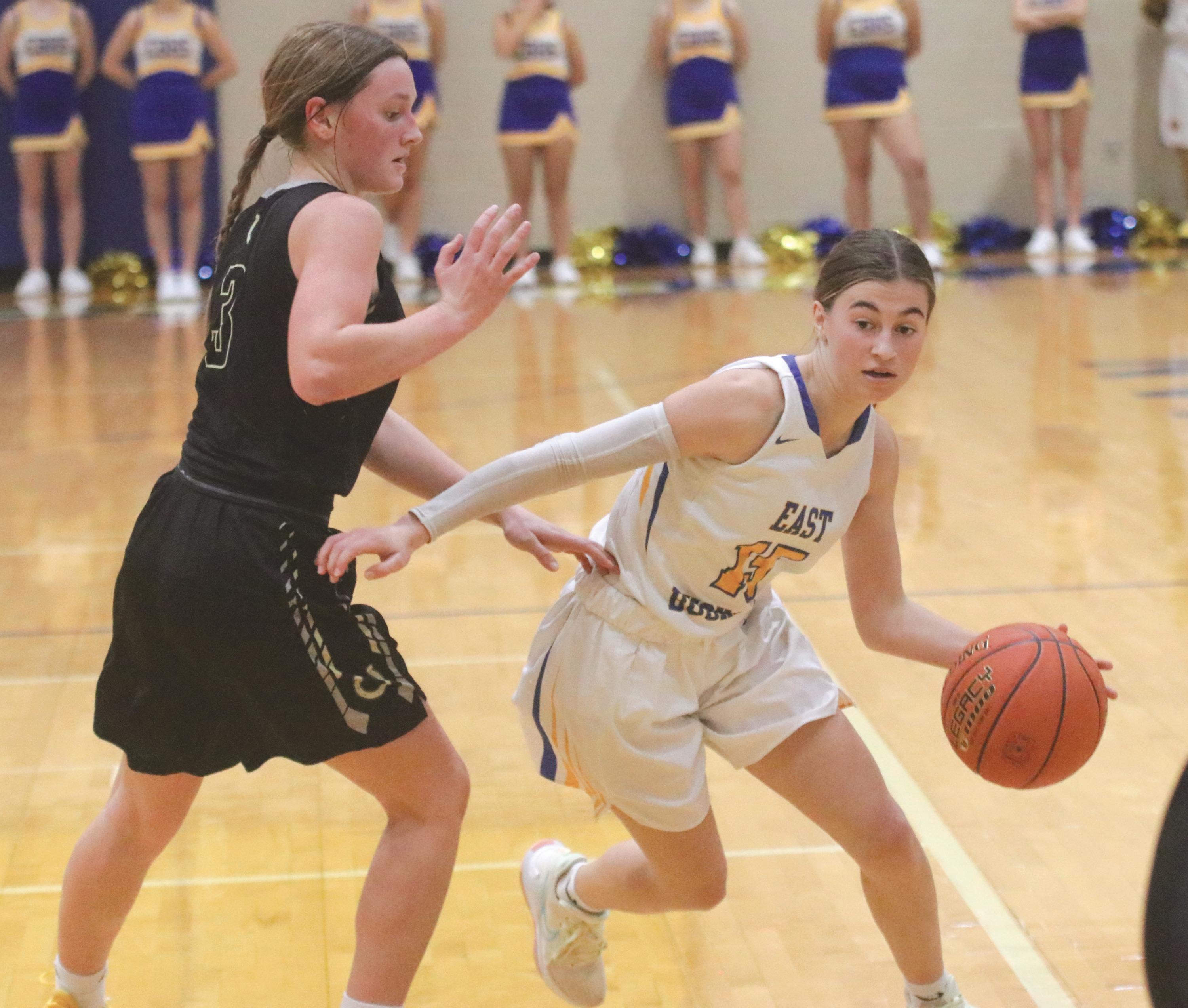 (Above) Lathrop senior Kaitlyn Morgan drives to the basket with East Buchanan’s Hilarry Elifrits defending. (Left) Lathrop senior Matt Miller and EBHS senior Jack Archdekin.