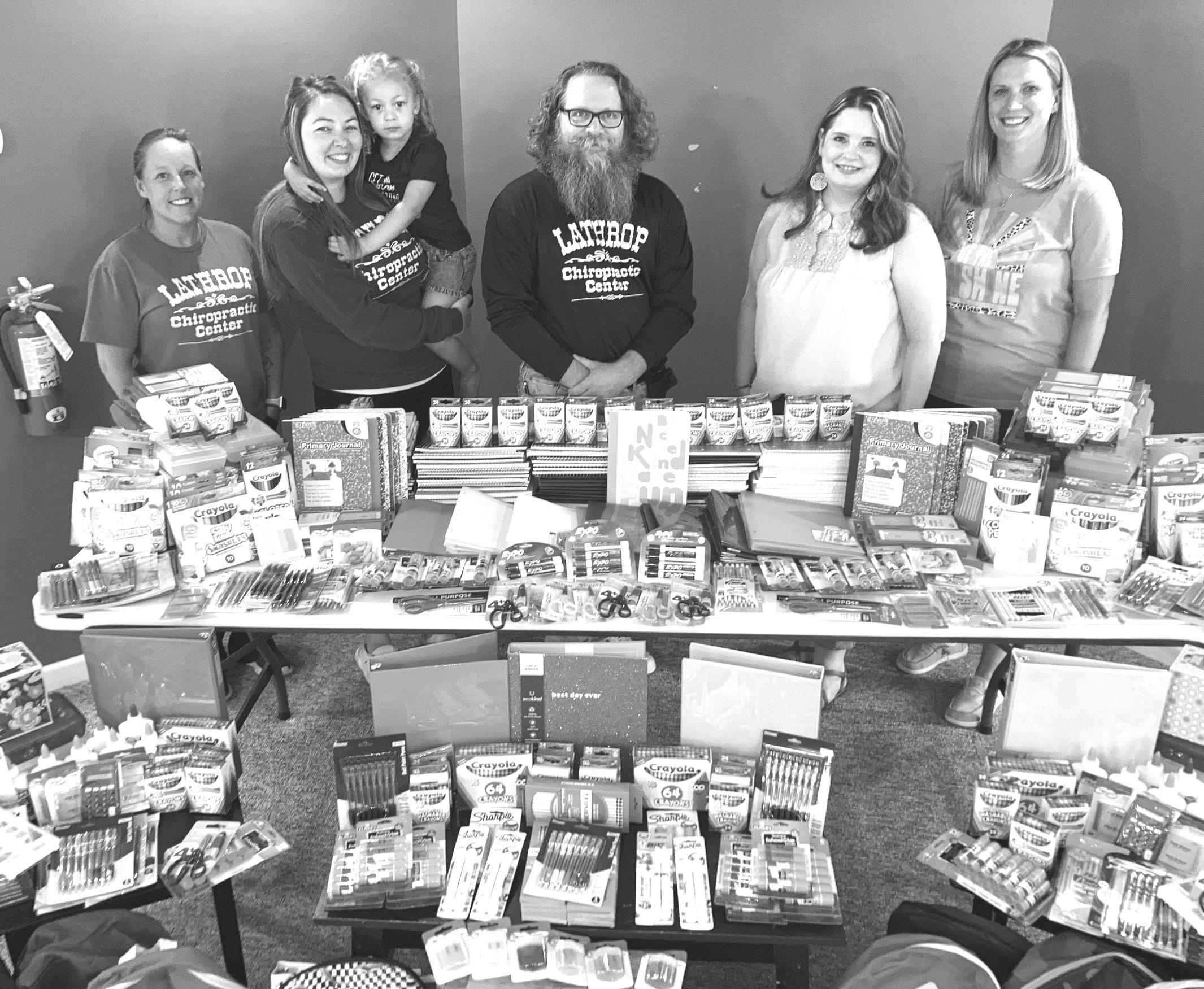 Dr. Kyle Beane and the fine folks at Lathrop Chiropractic Center once again helped ensure students in the Lathrop R-II School District will have the materials they need when they return to session this month. The center, with the help of their existing and new patients, collected more than 300 supply items and over $200 in their school supply donation drive. (Left to Right) Jennifer Bucy, Shelby Chambers (with Addison), and Dr. Kyle Beane, all with Lathrop
