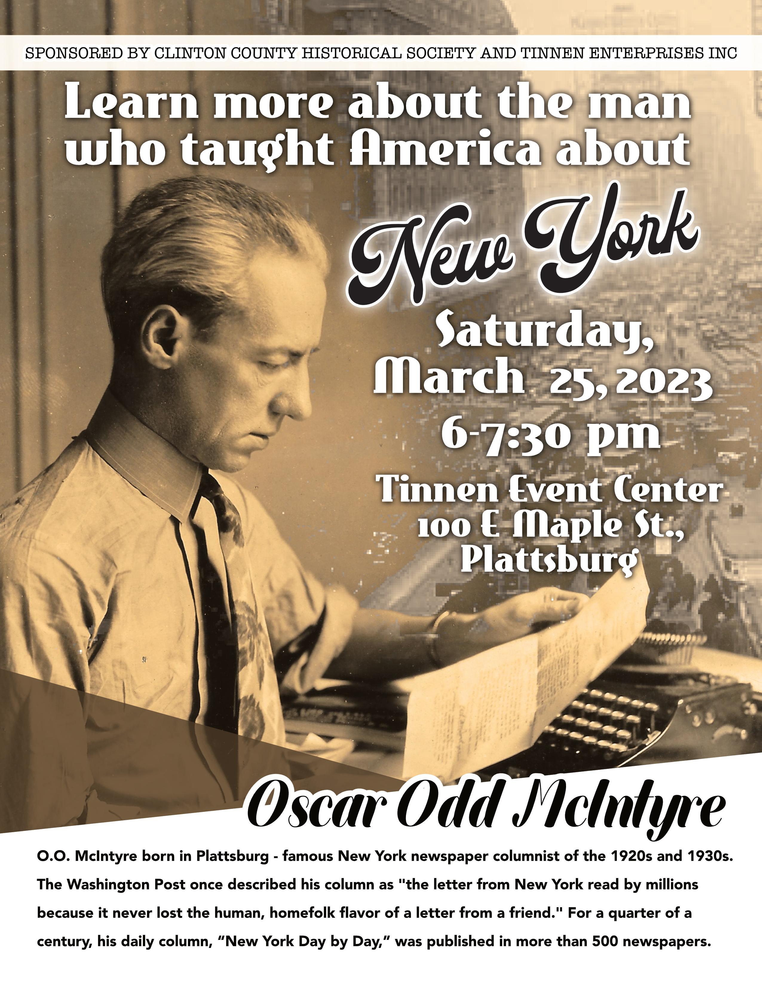 The notion that Oscar Odd McIntyre, born in Plattsburg, would go on to become one of the most well-respected columnists in the United States will be the feature of the Clinton County’s Historical Society’s event on Saturday, March 25. Tinnen Town