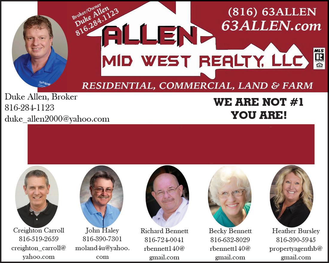 Keep warm this winter with a NEW FURNACE! We’re Here To Serve You! 660-646-0540 www.bottsandtye.com Call us to have your furnace CLEANED & SERVICED TODAY!! Ray Dockery BROKER/REALTOR 402 E. Evergreen St. Cameron, MO 64429 Cell: (816) 724-1808 Office: (816) 632-1088 raydockery@remax.net www.dockeryproperties.com Trust your important real estate transactions to a full-time Realtor with 48 years of real estate and banking experience! NORTH MISSOURI WEEKLY SPOTLIGHT Check out the impressive new Timberline Arena south of Jamesport. Their semi-annual sale will be Feb. 9th and 10th. Trenton's Five Points Alive Valentine's dinner is Feb. 11th, call Kathi 660-359-2858 122 E. 8th Street, Trenton, MO • 660-359-2212 • 102 E. Maple, Plattsburg, MO • 816-539-2111 Published by: Honeycutt Media GREEN HILLS MAIL DELIVERY TO HOMES 24,900 PAPER January 31, 2023 Weekly ECRWSS Standard Postage Paid Plattsburg, MO 64477 Permit No. 6 Postal Customers-Local One ad, one bill, six counties! 64601 Chillicothe 5245 64429 Cameron 4256 64683 Trenton 3838 64465 Lathrop 1789 64640 Gallatin 1621 64477 Plattsburg 1524 64644 Hamilton 1244 64671 Polo 824 64648 Jamesport 798 64624 Braymer 595 64642 Gillman City 369 64474 Osborn 334 64679 Spickard 328 64649 Kidder 320 64650 Kingston 258 64637 Cowgill 258 64493 Turney 242 64689 Winston 237 64641 Galt 228 64620 Altamont 209 64635 Chula 197 64652 Laredo 171 64647 Jameson 135 64646 Humphreys 130 Racks 350 Total 25,500 Dry, Mailed Copies GREEN HILLS PAPER 24,900 Weekly Honeycutt Media Your locally owned media partners NO DETAIL LEFT BEHIND Roof, Appliances, Flooring, Lighting, AC, Landscaping & Painting Lots of Natural Light • Easy flow from Kitchen to Living Area 3 Bedrooms • 2.5 Baths • Laundry on 2 Levels Lower Level Boasts a Man Cave that walks out to Fenced Yard Kearney Location - Call Cole Kemper Today 816-930-2000 • www.woodwardre.com Call 660-359-2212 to place your ad today!