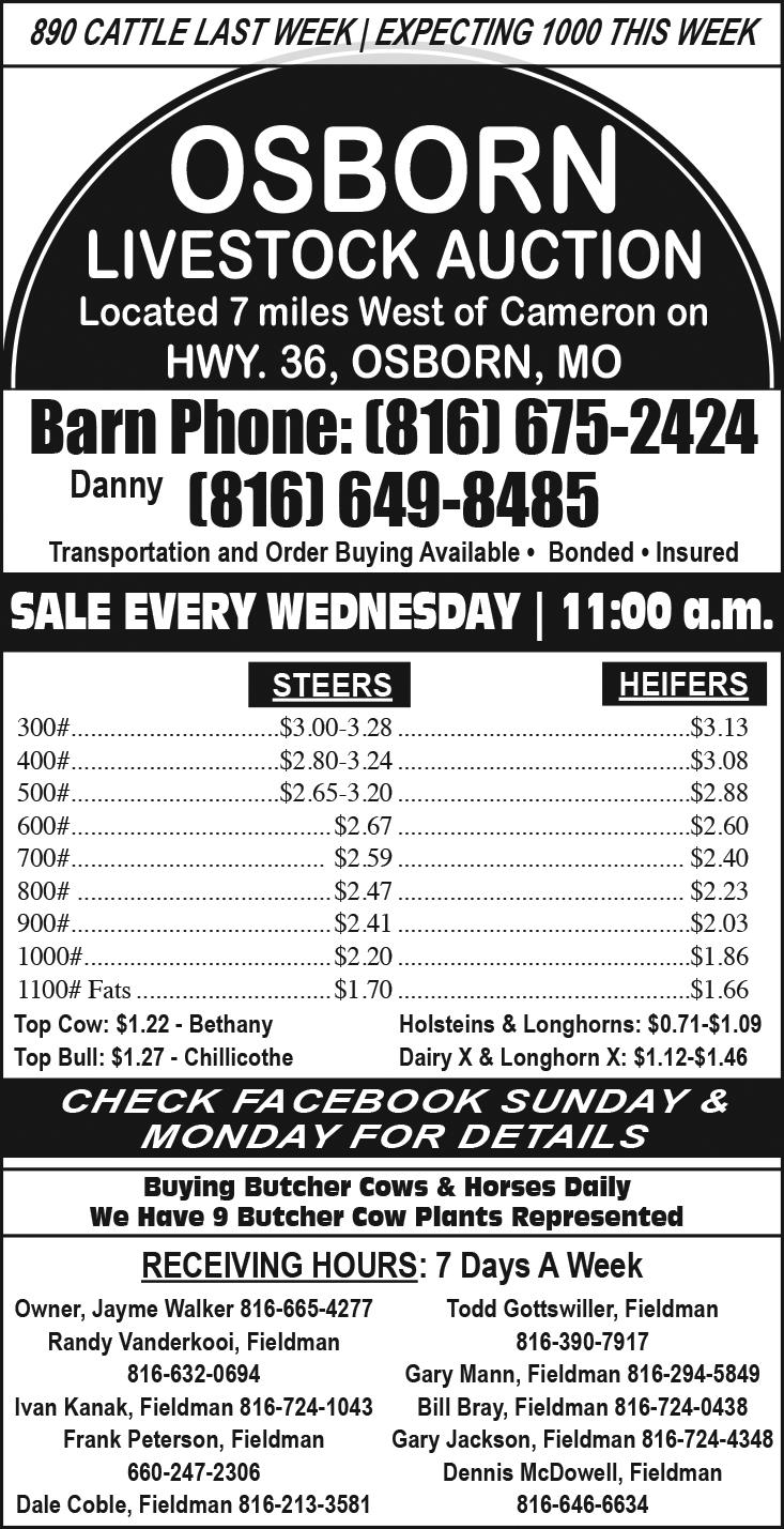 PAGE 10 TUESDAY, OCTOBER 10, 2023 THE GREEN HILLS WEEKLY PAPER RUSSELL LIVESTOCK MARKET 31683 US Hwy. 34, Russell, IA 50238 • Barn Phone (641) 535-6065 Weigh Cows - 9:00 am • Feeders - 11:00 am ** SPECIAL CATTLE SALE ** MOndAy, OCTOBeR 16, 2023 Weigh Cows - 10:00 am • Feeders - 11:00 am ** CATTLE SALE ** SATuRdAy, OCTOBeR 23, 2023 ** CASON’S PRIDE & JOY SIMMENTALS ** MATERNALLY INSPIRED FEMALE SALE SATuRdAy, nOveMBeR 4, 2023 - 12 pM ShARp! BARN WILL BE OPEN SUNDAYS 8 AM - 8 PM www.russelllivestockmarket.com • Barn: (641) 535-6065 WATCH OUR AUCTION LIVE @ www.dvauction.com Owners: Tony & Meshara Ballanger 641-777-3113 - Cell Owners: Shawn & Jana Murphy 641-777-0103 - Cell Field Rep: Justen Murphy 641-217-1235 - Cell Field Rep Brian Mitchell 515-360-1486 - Cell Field Rep: Tim Rinehart 660-425-0991 - Cell Fie d Rep: Aaron McGee 641-203-3043 - Cell Kingsville, MO For Information or to Schedule a Farm Visit call: Rick, Jeremy or Jared Anstine at the Sale Barn: 816.597.3331 Jeremy Anstine: 816-716-9288 • Jared Anstine: 816-878-5229 Tucker Anstine: 816-345-0860 • Alexa Anstine: 816-462-7418 Jimmie Long: 660-221-4992 • Derrick Atkins: 816-726-3456 Clay Barnhouse: 417-777-1855 • Doug Fager: 913-645-9497 Cody Fowler: 660-473-2030 Visit us at www.kingsvillelivestock.com Email anstineauction@gmail.com Steers 300-400 $270-$335 400-500 $260-$335 500-600 $240-$309 600-700 $230-$293.50 700-800 $220-$257.25 800-900 $220-$248.10 900-1000 $200-$225 Heifers 300-400 $240-$276.50 400-500 $230-$271 500-600 $220-$264.50 600-700 $210-$267.50